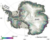 Bristol, UK (SPX) Jan 14, 2008 Increasing amounts of ice mass have been lost from West Antarctica and the Antarctic peninsula over the past ten years, according to research from the University of Bristol and published online this week in Nature Geoscience. Meanwhile the ice mass in East Antarctica has been roughly stable, with neither loss nor accumulation over the past decade. Professor Jonathan Bamber at the University of Bristol and colleagues estimated the flux of ice from the ice sheet into the ocean from satellite data that cover 85% of Antarctica's coastline, which they compared with simulations of snow accumulation over the same period, obtained using a regional climate model. They arrived at a best estimate of a loss of 132 billion tonnes of ice in 2006 from West Antarctica - up from about 83 billion tonnes in 1996 - and a loss of about 60 billion tonnes in 2006 from the Antarctic Peninsula. Professor Bamber said: "To put these figures into perspective, four billion tons of ice is enough to provide drinking water for the whole of the UK population for one year." The authors conclude that the Antarctic ice sheet mass budget is more complex than indicated by the evolution of its surface mass balance or climate-driven predictions. Changes in glacier dynamics are significant and may in fact dominate the ice sheet mass budget. This conclusion is contrary to model simulations of the response of the ice sheet to future climate change, which conclude that it will grow due to increased snowfall. The ice loss is concentrated at narrow glacier outlets with accelerating ice flow, which suggests that glacier flow has altered the mass balance of the entire ice sheet. Over the 10 year time period of the survey, the ice sheet as a whole was certainly losing mass, and the mass loss increased by 75% during this time. Most of the mass loss is from the Amundsen Sea sector of West Antarctica and the northern tip of the Peninsula where it is driven by ongoing, pronounced glacier acceleration. In East Antarctica, the mass balance is near zero, but the thinning of its potentially vulnerable marine sectors suggests this may change in the near future. Community Email This Article Comment On This Article Related Links Beyond the Ice Age