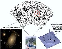 Waves separated by 500 million light years The sound waves propagated for the first million years of the Universe's history. Their existence was first predicted in 1970 and they were first seen in 1999 in fluctuations in the remnant light from the hot glow of the Big Bang known as the Cosmic Microwave Background. It had long been suggested that these sound waves should also be present in the distribution of galaxies, but the signal was predicted to be subtle and difficult to discern. To find the signal, the SDSS team mapped more than 46,000 very luminous red galaxies over a volume of space roughly five billion light years in diameter. They found a slight excess of galaxies with separations of 500 million light years, exactly the predicted signature of the sound waves. "This is just the scale predicted for these ripples", explained David Hogg of New York University, a member of the team. "The precise determination of the distance between ripples allows us to set the scale of the expansion of the universe, which in turn allows us to constrain the properties of both dark matter and dark energy." SDSS team member Kazuhiro Yahata of the University of Tokyo led a complementary analysis of quasar clustering and credits the huge volume of SDSS data that allows such findings. While Yahata's analysis did not directly detect the 500 million light year yardstick in the quasar distribution, its results are fully consistent with the presence of sound waves. A similar analysis on a different dataset by the Two Degree Field Galaxy Redshift Survey has also detected the sound waves. "It is impressive verification of the standard cosmological model that two groups with independent data have both made significant detections of the baryon induced features in large-scale galaxy clustering," said Shaun Cole of the University of Durham (UK), lead author of the Two Degree Field study. "The amazing thing about all these results is that they are in perfect accord with the predictions of our standard cosmological model, including both dark matter and dark energy," says Eisenstein. "So while it all fits together, it still leaves us 'in the dark' about the nature of these two mysterious components which dominate the energy of the universe." Community Email This Article Comment On This Article Related Links Sloan Digital Sky Survey University of Arizona SpaceDaily Search SpaceDaily Subscribe To SpaceDaily Express Nuclear Space Technology at Space-Travel.com