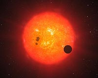 Paris, France (ESO) Dec 18, 2009 Astronomers have discovered the second super-Earth exoplanet for which they have determined the mass and radius, giving vital clues about its structure. It is also the first super-Earth where an atmosphere has been found. The exoplanet, orbiting a small star only 40 light-years away from us, opens up dramatic new perspectives in the quest for habitable worlds. The planet, GJ1214b, has a mass about six times that of Earth and its interior is likely to be mostly made of water ice. Its surface appears to be fairly hot and the planet is surrounded by a thick atmosphere, which makes it inhospitable for life as we know it on Earth. In this week's issue of Nature, astronomers announce the discovery of a planet around the nearby, low-mass star GJ1214. It is the second time a transiting super-Earth has been detected, after the recent discovery of the planet Corot-7b. A transit occurs when the planet's orbit is aligned so that we see it crossing the face of its parent star. The newly discovered planet has a mass about six times that of our terrestrial home and 2.7 times its radius, falling in size between the Earth and the ice giants of the Solar System, Uranus and Neptune. Although the mass of GJ1214b is similar to that of Corot-7b, its radius is much larger, suggesting that the composition of the two planets must be quite different. While Corot-7b probably has a rocky core and may be covered with lava, astronomers believe that three quarters of GJ1214b is composed of water ice, the rest being made of silicon and iron. GJ1214b orbits its star once every 38 hours at a distance of only two million kilometres - 70 times closer to its star than the Earth is to the Sun. "Being so close to its host star, the planet must have a surface temperature of about 200 degrees Celsius, too hot for water to be liquid," says David Charbonneau, lead author of the paper reporting the discovery. When the astronomers compared the measured radius of GJ1214b with theoretical models of planets, they found that the observed radius exceeds the models' predictions: there is something more than the planet's solid surface blocking the star's light - a surrounding atmosphere, 200 km thick. "This atmosphere is much thicker than that of the Earth, so the high pressure and absence of light would rule out life as we know it," says Charbonneau, "but these conditions are still very interesting, as they could allow for some complex chemistry to take place." "Because the planet is too hot to have kept an atmosphere for long, GJ1214b represents the first opportunity to study a newly formed atmosphere enshrouding a world orbiting another star," adds team member Xavier Bonfils. "Because the planet is so close to us, it will be possible to study its atmosphere even with current facilities." The planet was first discovered as a transiting object within the MEarth project, which follows about 2000 low-mass stars to look for transits by exoplanets. To confirm the planetary nature of GJ1214b and to obtain its mass (using the so-called Doppler method), the astronomers needed the full precision of the HARPS spectrograph, attached to ESO's 3.6-metre telescope at La Silla. An instrument with unrivalled stability and great precision, HARPS is the world's most successful hunter for small exoplanets. "This is the second super-Earth exoplanet for which the mass and radius could be obtained, allowing us to determine the density and to infer the inner structure," adds co-author Stephane Udry. "In both cases, data from HARPS was essential to characterise the planet." "The differences in composition between these two planets are relevant to the quest for habitable worlds," concludes Charbonneau. If super-Earth planets in general are surrounded by an atmosphere similar to that of GJ1214b, they may well be inhospitable to the development of life as we know it on our own planet. Share This Article With Planet Earth