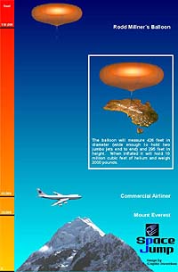 Sydney - March 5, 2001 Ex-commando Rodd Millner is planning to jump from the edge of space and parachute 130,000 feet (40 km) back to Earth. Millner will free-fall from the vacuum of space, through the frigid air of the earth's upper atmosphere before finally descending to earth. During his descent, where he will reach a speed of between 1600-1800 kilometers per hour (994-1118 miles per hour), Millner will become the first man to break the sound barrier unaided before opening his parachute to fall safely to earth. Millner's adventure, known as "Space Jump," will be filmed on 70mm film and High Definition video tape to create one a breathtaking giant format film that will be produced by international film company, Becker Entertainment. In March 2002, Millner will ascend from just outside Alice Springs, in the centre of Australia, in a special high altitude helium balloon manufactured by the Australian Defence Force Academy. As Millner climbs to the edge of space, he will gain a bird's eye view of spectacular Uluru (Ayers Rock) in the north east and the magnificent Kakadu in the far north of the Northern Territory. The special balloon will be the size of two football fields in dimension and could accommodate two jumbo jets side by side. It will take Millner approximately two and a half hours to ascend to 130,000 feet (40,000 metres) in his special balloon before taking less than 10 minutes to parachute to earth. Wearing a special high-tech suit, Millner will become the fastest unaided man, the highest skydiver, the longest free-faller and the highest balloonist ever to live. The Space Jump project has been 12 months in its research and development and will be managed by some of the most experienced high altitude balloon operators in the world. Using the latest robotic and film technology, Millner's special Space Jump suit will be equipped with a series of cameras to film his extraordinary experience. In addition, there will be special remote controlled cameras mounted to the balloon gondola, along with additional hot air balloon platforms at 10,000, 20,000 and 30,000 feet (3048, 6096 and 9144 metres). Next a high altitude Lear Jet will conduct filming up to 40,000 feet (12,192 metres), and which will be joined by a team of sky divers filming from 40,000 feet. Project Director of Space Jump, Walt Missingham, said the project has already seen millions invested. "We have involved a special team of experts across a wide range of scientific and technological areas to ensure this project is successfully conducted with optimum safety and with spectacular visual effect," said Missingham. Community Email This Article Comment On This Article Related Links SpaceDaily Search SpaceDaily Subscribe To SpaceDaily Express Space Tourism, Space Transport and Space Exploration News