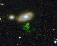 Hooghalen, Netherlands (SPX) Nov 26, 2008 New observations made by radio telescopes have finally revealed the nature of the bizarre object known as "Hanny's voorwerp" (SDSS J094103.80+344334.2). The Voorwerp was discovered by Hanny van Arkel, a Dutch school teacher and an enthusiastic volunteer of the Galaxy Zoo project. While surfing through hundred's of images, Hanny noticed a huge green irregular cloud of gas of galactic scale, located about 60,000 light years from a nearby galaxy, IC2497. The object has had astronomers scratching their heads for over a year now - the extent of the cloud is enormous and the gas is extremely hot (> 15000 Celsius) but paradoxically it is devoid of stars. An international team of astronomers, led by Prof. Mike Garrett (ASTRON/Leiden) , and including Hanny van Arkel herself, have observed IC2497 and the Voorwerp with the Westerbork Synthesis Radio Telescope (WSRT) and an e-VLBI array in which the WSRT also participated. The picture that is emerging from these data is that a jet of highly energetic particles is being generated by a massive black hole at the centre of IC2497. "It looks as though the jet emanating from the black hole clears a path through the dense interstellar medium of IC 2497 towards Hanny's Voorwerp", says Garrett. "This cleared channel permits the beam of intense optical and ultraviolet emission associated with the black hole, to illuminate a small part of a large gas cloud that partially surrounds the galaxy. The optical and ultraviolet emission heats and ionises the gas cloud, thus creating the phenomena known as Hanny's voorwerp. One remaining question is where does all the hydrogen gas come from? "There is a lot of gas out there - the WSRT observations detect a huge stream of gas that is extended across hundreds of thousands of light years", says Dr. Gyula Jozsa, another member of the team. According to Jozsa the total mass of gas is about 5000 million times the mass of the sun. It's something Dr. Tom Oosterloo thinks he has seen before: "It has all the hallmarks of an interacting system - the gas probably arises from a tidal interaction between IC 2497 and another galaxy, several hundred million years ago". Oosterloo also thinks he can identify the culprits, "the stream of gas ends three hundred thousand light years westwards of IC2497 - all the evidence points towards a group of galaxies at the tip of the stream being responsible for this freak cosmic accident". Hanny van Arkel, who is visiting the team at ASTRON this week is impressed: "I'm happy we are making progress. Apparently the more we learn about the Voorwerp, the more intriguing it becomes". Garrett and his team agree - "We think the Voorwerp has a few more secrets to reveal". The team plan much deeper observtions with the WSRT, and with other, higher resolution radio telescopes soon. Share This Article With Planet Earth