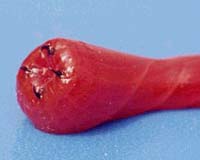 Santa Barbara - Oct 11, 2002 Researchers report in the Oct. 11 "Science" the first detection of a living organism that makes a copper-containing mineral structure as part of its skeleton. The finding is remarkable because the amount of copper detected in the jaw tip of the marine bloodworm would normally be toxic to an organism. The researchers determined that copper also occurs in non-mineral form in the bloodworm jaw where it may act as a structural element in cross-linking long chains of fibrous proteins. According to the authors, "The marriage of protein with copper mineral as well as with bound copper ions is an intriguing concept per se but may also serve as a design prototype for new materials that need to be hard, lightweight, and durable." In addition, they found the non-mineral form of copper on the surface of the jaw canal through which venom is injected. That copper may be acting as a catalyst that activates venom being discharged by the worm into its prey. The authors include University of California Biology Professor Herbert Waite and Chemistry and Materials Professor Galen Stucky. First author Helga Lichtenegger, who was trained in Austria as a physicist, approached Waite and Stucky about working with them on a research project. Waite dipped into a repository of promising projects, which he calls his "orphans," and suggested Glycera dibranchiata--better known to fishermen as the common bloodworm, "favorite bait for certain kinds of fish," according to Waite. "Back in 1980 two British investigators reported high levels of copper [up to 13 percent by weight] and zinc in the jaws or fangs of two rather common species of polychaete worms," said Waite, who is an expert on mussels and the fibers mussels make to attach themselves to stones in inter-tidal basins. The mussel fibers consist largely of proteins, but one percent of their weight content is metallic--copper, zinc, or iron. "I have been trying to understand what role these transition metals play in those fibers," said Waite. "We have discovered that if we leach out the metals, the structure is weaker." Because of Waite's long-standing interest in metals in mussel fibers, he had earmarked the 1980 report on the copper and zinc in blood- and clamworms as intriguing. Funding sources, however, failed to share Waite's enthusiasm for the worms. Supported by the Austrian Science Fund (Fonds zur Foerderung der wissenschaftlichen Forschung, FWF), Lichtenegger joined Waite and Stucky as a postdoctoral fellow at UCSB to study the worms despite the absence of specific funding for the project. "We had an enormously good time," said Waite. "It is really nice once in a while to do whatever your intellect dictates. We didn't have enough preliminary information to justify independent funding for the project. It just seemed an interesting orphan." "Orphan" though the genesis be, the progeny of the research are not. In addition to providing a possible paradigm for a new material system, other possible applications include, for instance, drug delivery. This research is an example of biomimetics, whereby an organism's biomolecular strategies for adaptation are studied and then employed to make new materials and devices. The "Science" paper focuses on the first step of determining and understanding the organism's biomolecular structures and raises even more tantalizing questions about them than it answers. A skilled x-ray scattering specialist, Lichtenegger and another postdoc in Stucky's group in the UCSB Department of Chemistry and Biochemistry, Michael Bartl (also an author on the "Science" paper), employed a full arsenal of high resolution imaging techniques to study the worms. "The thing that really galvanized our attention," said Waite, "was Helga's detection of copper biomineral at the bloodworm's jaw tip." The 1980 findings gave no indication that the copper was associated with a mineral. As the authors state at the outset of the "Science" paper, "Biomineralization is a major strategy for tissue hardening and manifests an astonishing diversity of bioceramic structures with exquisite microarchitectures that have specially adapted physical properties." Ten to 15 inches long, the bloodworm comes equipped with a proboscis not ordinarily visible. The proboscis is hydrostatically ejected--i.e., water pressure is used to extend it fast the way a paper noisemaker unfurls when blown. At the end of the fleshy red-pink proboscis are four black jaws that resemble in shape the thorns on a rose bush. The jaws at the end of the proboscis grab and bite prey the way four-pronged devices at the end of long poles are used to grasp and to pluck products from the high shelves of a grocery store. In contrast to the clamworm, the bloodworm's jaws are hollow, like syringes, and are used to conduct venom into the prey. The researchers found that the jaw tip exhibits the ordered crystalline structure of the copper-based biomineral atacamite [Cu2(OH)3Cl], the first discovered instance of a copper biomineral in a living organism. "Copper is very nasty stuff," said Waite. "Though needed in trace amounts for enzymatic processes, copper in greater quantities is toxic. Our research leaves us with questions. How does the worm collect all this copper and concentrate it in a safe form until it is invested in these jaws? What kind of biochemical pathways has this organism evolved to prevent copper toxicity, and what kind of protein carriers are there that bring it to the site of mineralization?" The bloodworm lives in the gravel of marine sediments and smells out its prey, explains Waite. "The worm is going to miss its prey a fair number of times," he said. "And that means that its jaws are being abraded by gravel. So they need to be made of more robust material than the jaws of the clamworm, which is a scavenger and lives by grabbing things that have died." The researchers found that the bloodworm's unmineralized copper as well as the copper biomineral is concentrated 