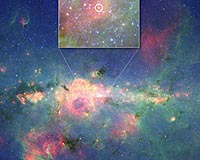 Pasadena CA (JPL) Jul 16, 2008 A contender for the title of brightest star in our Milky Way galaxy has been unearthed in the dusty metropolis of the galaxy's center. Nicknamed the "Peony nebula star," the bright stellar bulb was revealed by NASA's Spitzer Space Telescope and other ground-based telescopes. It blazes with the light of an estimated 3.2 million suns. The reigning "brightest star" champion is Eta Carina, with a whopping solar wattage of 4.7 million suns. But according to astronomers, it's hard to pin down an exact brightness, or luminosity, for these scorching stars, so they could potentially shine with a similar amount of light. "The Peony nebula star is a fascinating creature. It appears to be the second-brightest star that we now know of in the galaxy, and it's located deep into the galaxy's center," said Lidia Oskinova of Potsdam University in Germany. "There are probably other stars just as bright if not brighter in our galaxy that remain hidden from view." Oskinova is principal investigator for the research and second author of a paper appearing in a future issue of the journal Astronomy and Astrophysics. Scientists already knew about the Peony nebula star, but because of its sheltered location in the dusty central hub of our galaxy, its extreme luminosity was not revealed until now. Spitzer's dust-piercing infrared eyes can see straight into the heart of our galaxy, into regions impenetrable by visible light. Likewise, infrared data from the European Southern Observatory's New Technology Telescope in Chile were integral in calculating the Peony nebula star's luminosity. "Infrared astronomy opens extraordinary views into the environment of the central region of our galaxy," said Oskinova. The brightest stars in the universe are also the biggest. Astronomers estimate the Peony nebula star kicked off its life with a hefty mass of roughly 150 to 200 times that of our sun. Stars this massive are rare and puzzle astronomers because they push the limits required for stars to form. Theory predicts that if a star starts out too massive, it can't hold itself together and must break into a double or multiple stars instead. Not only is the Peony nebula star hefty, it also has a wide girth. It is a type of giant blue star called a Wolf-Rayet star, with a diameter roughly 100 times that of our sun. That means this star, if placed where our sun is, would extend out to about the orbit of Mercury. With so much mass, the star barely keeps itself together. It sheds an enormous amount of stellar matter in the form of strong winds over its relatively short lifetime of a few million years. This matter is pushed so hard by strong radiation from the star that the winds speed up to about 1.6 million kilometers per hour (one million miles per hour) in only a few hours. Ultimately, the Peony nebula star will blow up in a fantastic explosion of cosmic proportions called a supernova. In fact, Oskinova and her colleagues say that the star is ripe for exploding soon, which in astronomical terms mean anytime from now to millions of years from now. "When this star blows up, it will evaporate any planets orbiting stars in the vicinity," said Oskinova. "Farther out from the star, the explosion could actually trigger the birth of new stars." In addition to the star itself, the astronomers noted a cloud of dust and gas, called a nebula, surrounding the star. The team nicknamed this cloud the Peony nebula because it resembles the ornate flower. "The nebula was probably created from the spray of dust leaking off the massive Peony nebula star," said Andreas Barniske of Potsdam University, lead author of the study. Wolf-Rainer Hamann, also of Potsdam University, is another co-author of the paper and the principal investigator of a Spitzer program enabling this research. Community Email This Article Comment On This Article Share This Article With Planet Earth