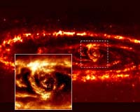 Cambridge MA (SPX) Oct 19, 2006 The Andromeda galaxy, the closest large spiral to the Milky Way, appears calm and tranquil as it wheels through space. But appearances can be deceiving. Astronomers have new evidence that Andromeda was involved in a violent head-on collision with the neighboring dwarf galaxy Messier 32 (M32) more than 200 million years ago. "Like a CSI team, we gathered clues and reconstructed the scene of the crime," said Pauline Barmby (Harvard-Smithsonian Center for Astrophysics), a member of the research group that made the discovery. "The evidence clearly shows that M32 is guilty of committing a hit-and-run." This discovery was reported in the October 19 issue of the journal Nature. Dramatic proof of the galactic smash-up came from images taken by the Infrared Array Camera (IRAC) on NASA's Spitzer Space Telescope. Those images revealed a never-before-seen dust ring deep within the Andromeda galaxy. When combined with a previously observed outer ring, the presence of both dust rings suggests a long-ago disturbance whose effects are still expanding outward through Andromeda. "These dust rings are like ripples in a pond," said David Block (University of the Witwatersrand, Johannesburg), who is the lead author on the paper. "Plop a stone into water and you get an expanding series of rings or waves. Let a small galaxy collide nearly head-on with a larger one, and you will see waves or rings of gas and dust that propagate outward as a result of the violent gravitational interaction. "While our Atlantic Ocean was still forming, Messier 32 plowed head-long into Andromeda's disk of gas and stars," he added. "Only roaming dinosaurs saw the crash and held the secret, until the Spitzer Space Telescope spilled the beans." Research team members Frederic Bournaud and Francoise Combes (Observatoire de Paris) conducted a series of computer simulations to model the collision between Andromeda and M32. They found that M32 plunged through the disk of Andromeda along Andromeda's polar axis approximately 210 million years ago. Since M32 is much less massive than Andromeda, the latter was not substantially disrupted, but the smaller galaxy lost more than half its initial mass in the course of the collision. "To continue the hit-and-run analogy, you could compare M32 to a compact car while Andromeda would be an 18-wheeler," explained Barmby. "In a collision between the two, the truck would be almost unharmed while the car would be wrecked. Similarly, M32 was much more damaged than Andromeda." Astronomers have predicted that Andromeda and the Milky Way will collide in approximately 5 to 10 billion years. That collision will erase the separate identities of each galaxy, leaving a single elliptical galaxy in their place. This discovery was made with Spitzer's Infrared Array Camera, built primarily at NASA Goddard Space Flight Center in Greenbelt, Maryland. The instrument's principal investigator is Giovanni Fazio of CfA. The Jet Propulsion Laboratory, in Pasadena, California, manages the Spitzer Space Telescope mission for NASA's Science Mission Directorate, Washington. Science operations are conducted at the Spitzer Science Center at the California Institute of Technology in Pasadena. Community Email This Article Comment On This Article Related Links Harvard-Smithsonian Center for Astrophysics Stellar Chemistry, The Universe And All Within It Stellar Chemistry, The Universe And All Within It