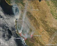 Washington DC (SPX) Jul 03, 2008 Numerous wildfires continue to burn out of control throughout California. Many of these fires were ignited in late June by dry lighting and made worse by parched conditions and a lack of rainfall, fire officials report. NASA's Aqua satellite captured this image of several of the blazes as it passed over California on June 30, 2008. This image specifically shows the fires burning in the area south of Monterey, some of the state's largest according to fire officials. Active fires are outlined in red. Smoke can also be seen billowing north up the California coastline. According to news reports, about 364,600 acres, or almost 570 square miles, of land throughout the state have already burned, and most of the blazes have not yet been contained. Skies in the north were mostly cloudy when NASA's Aqua satellite passed over California on June 30, 2008, but the Moderate Resolution Imaging Spectroradiometer (MODIS) sensor was able to get this cloud-free shot of Southern California showing fires burning south of Monterey. Places where the sensor detected actively burning fires are outlined in red. Smoke spreads north up the coast. The two fires pictured are among the largest of scores of fires burning in the state. According to the July 1 report from the National Interagency Fire Center, the Indians Fire was 81,378 acres and 95 percent contained; the Basin Complex Fire was 39,906 acres and 3 percent contained. The high-resolution image provided above is at MODIS' maximum spatial resolution (level of detail) of 250 meters per pixel. The MODIS Rapid Response Team provides twice-daily images of Northern and Southern California in additional resolutions and formats, including an infrared-enhanced version that highlights the presence of burned ground. Community Email This Article Comment On This Article Share This Article With Planet Earth