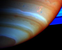 Pasadena CA (SPX) Dec 27, 2005With its thick, distended atmosphere, Titan's orange globe shines softly, encircled by a thin halo of purple light-scattering haze. |