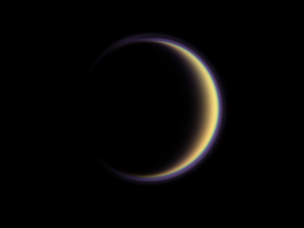 Pasadena CA (SPX) Dec 27, 2005 With its thick, distended atmosphere, Titan's orange globe shines softly, encircled by a thin halo of purple light-scattering haze. Images taken using blue, green and red spectral filters were used to create this enhanced-color view; the color images were combined with an ultraviolet view that makes the high-altitude, detached layer of haze visible. The ultraviolet part of the composite image was given a purplish hue to match the bluish-purple color of the upper atmospheric haze seen in visible light. Small particles that populate high hazes in Titan's atmosphere scatter short wavelengths more efficiently than longer visible or infrared wavelengths, so the best possible observations of the detached layer are made in ultraviolet light. The images in this view were taken by the Cassini narrow-angle camera on May 5, 2005, at a distance of approximately 1.4 million kilometers (900,000 miles) from Titan and at a sun-Titan-spacecraft, or phase, angle of 137 degrees. Image scale is 8 kilometers (5 miles) per pixel. Community Email This Article Comment On This Article Related Links Cassini at JPL Cassini Image Team SpaceDaily Search SpaceDaily Subscribe To SpaceDaily Express Explore The Ring World of Saturn and her moons Jupiter and its Moons The million outer planets of a star called Sol News Flash at Mercury