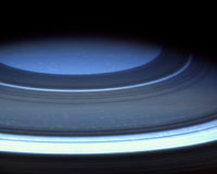Pasadena CA (SPX) Feb 11, 2005 Colorful new images from the Cassini spacecraft show that Saturn's northern hemisphere has a case of the blues. In the first image, the icy moon Mimas is set against a dazzling and dramatic portrait of Saturn's azure northern hemisphere and the shadows of its rings. A second image shows Saturn's northern polar region is a dim blue. The blue color of Saturn's northern latitudes may to be linked to the apparently cloud-free nature of the upper atmosphere there. A precise understanding of the phenomenon may come from further study by Cassini imaging scientists. In the first of these colorful views, Mimas moves in its orbit against the blue backdrop of Saturn's atmosphere, which is draped by sweeping shadows cast by the rings. A few large craters are visible on Mimas, giving the icy moon a dimpled appearance.