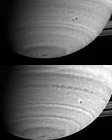Pasadena - Apr 13, 2004 Three months before Saturn arrival, the Cassini spacecraft has observed two storms in the act of merging into one larger storm. This is only the second time this phenomenon has been observed on the ringed planet. "Merging is one of the distinct features of storms in the giant planet atmospheres," said Dr. Andrew Ingersoll, member of the Cassini imaging team and professor of planetary science at the California Institute of Technology in Pasadena, Calif. "On Earth, storms last for a week or so and usually fade away when they enter the mature phase and can no longer extract energy from their surroundings. On Saturn and the other giant planets, storms last for months, years, or even centuries, and instead of simply fading away, many storms on the giant planets end their lives by merging. How they form, however, is still uncertain," Ingersoll said. With diameters close to 1,000 kilometers (621 miles), both storms were seen moving west, relative to the rotation of Saturn's interior, for about a month before they merged on March 19 through 20, 2004. The northern storm moved about twice as fast as the southern storm, 11 meters versus 6 meters per second (25 versus 13 mph) respectively. They approached each other like two cars on a highway and spun around each other in a counterclockwise direction as they merged. This is the opposite of how hurricanes spin in the southern hemisphere on Earth. Just after the merger, on March 20, the new storm was elongated in the north-south direction, with bright clouds on either end. Two days later the storm settled into a more circular shape and the bright clouds were spread around the circumference to form a halo. Whether the bright clouds are particles of a different composition or simply at a different altitude is uncertain. Although these storms move slowly west, storms at Saturn's equator move east at speeds up to 450 meters per second (1,000 mph), which is 10 times the speed of Earth's jet streams and three times greater than the equatorial winds on Jupiter. "Saturn is the windiest planet in the solar system," said Ingersoll, "and that's a huge mystery. We'll be getting closer to the planet all the way through June, so maybe we'll find out." Images from the Voyager spacecraft flybys of Saturn in August 1981 show storms partially merging, but to see them with Cassini this far out from Saturn is a mouthwatering surprise to scientists because they will get even closer during the Cassini four-year Saturn tour. "I'm optimistic because these images are already so good. The best is yet to come," said Ingersoll. Community Email This Article Comment On This Article Related Links Cassini Imaging Team Cassini-Huygens at JPL SpaceDaily Search SpaceDaily Subscribe To SpaceDaily Express Explore The Ring World of Saturn and her moons Jupiter and its Moons The million outer planets of a star called Sol News Flash at Mercury