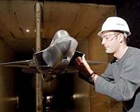 Arnold AFB TN (AFNS) Jul 21, 2006 Arnold Engineering Development Center recently conducted successful aerodynamic loads testing on a 12-percent scale model of the Lockheed Martin F-35 Joint Strike Fighter in the center's 16-foot transonic wind tunnel. The test was tentatively the next to last in a series of similar tests providing critical support to the F-35 program before aircraft production can commence. The F-35 model, which had modified exterior mold lines, is capable of being reconfigured, allowing the test team from Lockheed Martin to run it in two variants, a conventional takeoff and landing version for the U.S. Air Force and a short takeoff and vertical landing for use by the U.S. Marines, the Royal Navy and Royal Air Force. "They were looking at the aerodynamic loads on the wings, overall aircraft and the horizontal tail," said Melissa Minter, an Aerospace Testing Alliance project engineer at the Propulsion Wind Tunnel Facility. The F-35 is a stealth, multi-role fighter with both air-to-ground and air-to-air capabilities. It is designed to meet the warfighting needs, including survivability, precision engagement capability and mobility, of the U.S. Air Force, Navy, Marines and allies. The aircraft exploits a high level of commonality and modularity to maximize affordability, keeping life cycle costs down. The Air Force's version is intended to replace the F-16 Fighting Falcon and the A-10 Thunderbolt II. The short takeoff and vertical landing version will replace the Marine Corp's AV-8B Harrier, the Royal Navy's Sea Harrier and the Royal Air Force's GR7 Harrier. The Department of Defense selected Lockheed Martin's version of the Joint Strike Fighter as the winner of the competition to develop the new fighter in 2001. "The critical design reviews for the F-35 conventional takeoff and landing and short takeoff and vertical landing variants are complete," noted Marc Skelley, Defense Department project manager at Arnold Engineering Development Center. "The next step is the critical design reviews for the carrier variant, where the program office approves the final design and the airplane moves into production," he said. "We're tailing off on the end of our Joint Strike Fighter wind tunnel testing," Skelley said. "The unique part of loads testing is that we put hundreds of pressure taps all over the fuselage, the wings and tail - to get a pressure distribution of the load acting on all of the vehicle's surfaces." "Lockheed analysts take that data and use it to design the structure of the aircraft," he explained. "The next and last test in this series is tentatively scheduled for later this year." "That one and the few other wind tunnel tests remaining will allow the Lockheed team to build that final aerodynamic database," Skelley concluded.