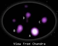 Cambridge MA (SPX) Jul 07, 2004 NASA�s Chandra X-ray Observatory has uncovered evidence that a single star in a foreground galaxy may have magnified X-rays coming from a rare quadruple quasar. About 11 billion light years from Earth, the Cloverleaf quasar is a single object that appears as four images. The Marshall Center manages the Chandra program. A careful analysis of observations by NASA's Chandra X-ray Observatory of a rare quadruple quasar has uncovered evidence that possibly a single star in a foreground galaxy magnified X-rays coming from the quasar. This discovery gives astronomers a new and extremely precise probe of the gas flow around the supermassive black hole that powers the quasar. "If our interpretation is correct, then we are seeing details around this black hole that are 50,000 times smaller than either the Hubble Space Telescope or Chandra could see under ordinary circumstances," said George Chartas of Penn State University in University Park, and lead author of a recent article on the Cloverleaf quasar in The Astrophysical Journal. The Cloverleaf quasar is a single object about 11 billion light years from Earth that appears as four images produced by a process known as gravitational lensing. If one or more galaxies lie along the line of sight to a more distant quasar, the gravitational field of the intervening galaxies can bend and magnify the light from the quasar and produce multiple images of it. The four images of the Cloverleaf quasar have been produced by one or more intervening galaxies. One of the images (A), in the Cloverleaf is brighter than the others in both optical and X-ray light. Chartas and his colleagues found the relative brightness of this image was greater in X-ray than in optical light. The X-rays from iron atoms were also enhanced relative to X-rays at lower energies. Since the amount of brightening due to gravitational lensing does not vary with the wavelength, this means that an additional object has magnified the X-rays. The increased magnification of the X-ray light can be explained by gravitational microlensing, an effect which has been used to search for compact stars and planets in our galaxy. Microlensing occurs when a star or a multiple star system passes in front of light from a background object. If a single star or a multiple star system in one of the foreground galaxies passed in front of the light path for the brightest image, then that image would be selectively magnified. The X-rays would be magnified much more than the visible light, if they came from a smaller region around the black hole than the visible light. The enhancement of the X-rays from iron ions would be due to this same effect. The analysis indicates that the X-rays are coming from a very small region, about the size of the solar system, around the supermassive black hole. The visible light is coming from a region ten or more times larger. The angular size of these regions at a distance of 11 billion light years is tens of thousands times smaller than the smallest region that can be resolved by the Hubble Space Telescope. "The significance of the detection of microlensed X-rays from the Cloverleaf quasar lies in the extremely small region that is enhanced by the microlens," said Chartas. "This gives us the ability to make strong tests of models for the flow of gas around a supermassive black hole." Community Email This Article Comment On This Article Related Links Chandra X-ray Observatory SpaceDaily Search SpaceDaily Subscribe To SpaceDaily Express Nuclear Space Technology at Space-Travel.com