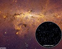 Boston, UK (SPX) May 01, 2009 An extremely deep Chandra X-ray Observatory image of a region near the center of our galaxy has resolved a long-standing mystery about an X-ray glow along the plane of the galaxy. The glow in the region covered by the Chandra image was discovered to be caused by hundreds of point-like X-ray sources, implying that the glow along the plane of the galaxy is due to millions of such sources. This image shows an infrared view from the Spitzer Space Telescope of the central region of the Milky Way, with a pullout showing a Chandra image of a region located only 1.4 degrees away from the center of the galaxy. The so-called galactic ridge X-ray emission was first detected more than two decades ago using early X-ray observatories such as HEAO-1 and Exosat. The ridge was observed to extend about two degrees above and below the plane of the galaxy and about 40 degrees along the plane of the galaxy on either side of the galactic center. It appeared to be diffuse. One interpretation of the galactic X-ray ridge is that it is emission from 100-million-degree gas. This interpretation is problematic because the disk of the galaxy is not massive enough to confine such hot gas, which should flow away in a wind. Replenishing the gas would then be a problem, since plausible sources of energy such as supernovas are not nearly powerful enough. A very deep Chandra observation, lasting for about 12 days, was used to study the nature of this ridge emission. The field was chosen to be close enough to the galactic plane so that the ridge emission was strong, but in a region with relatively little absorption from dust and gas to maximize the number of sources that might be detected. A total of 473 sources were detected in an area on the sky only about 3% of the size of the full Moon, one of the highest densities of X-ray sources ever seen in our galaxy. It was found that more than 80% of the seemingly diffuse ridge of X-ray emission was resolved into individual sources. These are believed to be mostly white dwarfs pulling matter from companion stars and double stars with strong magnetic activity that are producing X-ray outbursts or flares that are similar to, but more powerful than the flares seen on the Sun. These stars are unrelated to the large-scale structures seen towards the center of the Spitzer image, which are probably caused by young massive stars. The paper reporting these results appears in the April 30th issue of Nature. This work was led by Mikhail Revnivtsev from the Excellence Cluster Universe, Technical University Munich, in Garching, Germany, and from the Space Research Institute, in Moscow, Russia. The co-authors were Sergey Sasanov of the Space Research Institute in Moscow, Russia; Eugene Churazov of the Max Planck Institute for Astrophysics (MPA) in Garching, Germany; William Forman and Alexey Vikhlinin from the Harvard-Smithsonian Center for Astrophysics and Rashid Sunyaev from MPA. NASA's Marshall Space Flight Center in Huntsville, Ala., manages the Chandra program for NASA's Science Mission Directorate in Washington. The Smithsonian Astrophysical Observatory controls Chandra's science and flight operations from Cambridge, Mass. Share This Article With Planet Earth