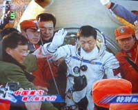 Beijing (AFP) Oct 16, 2003 China completed its first manned space flight Thursday when the Shenzhou V capsule with astronaut Yang Liwei returned safely to Earth, sparking celebrations and a pledge of a new mission within two years. The capsule landed at 6:23 a.m. (2223 GMT Wednesday) just 4.8 kilometres (2.9 miles) off target in the vast grasslands of the Inner Mongolia region some 300 kilometres (186 miles) northwest of Beijing. Lieutenant Colonel Yang, 38, was in good health and the Beijing Space Command and Control Centre and Premier Wen Jiabao announced the mission a "complete success." Yang exited the capsule on his own, looking dazed, and was seen on television waving following his 21-hour flight that covered 600,000 kilometres (372,000 miles). He was immediately steered to a chair outside the module and was carried through a large crowd of jostling officials and media to a nearby van for a medical before being flown by helicopter to Beijing. "I feel proud of my motherland," Yang said soon after landing. "The spacecraft operated normally. I felt very good." Premier Wen congratulated him by telephone on behalf of government and military officials. China's leaders had much riding on a successful mission, hoping it would promote patriotism, national cohesion and legitimacy for its rule and state-run television devoted extensive coverage to the "glorious" return. Xie Mingbao, director of the China Manned Space Program's office told a news conference another Shenzhou mission would be launched "in one to two years time." China's Aerospace Command and Control Centre gave the order at 5:35 a.m (2135 GMT) for Yang to begin his descent after he had orbited Earth 14 times. The touchdown marked the end of a history-making flight, which blasted off from Jiuquan in northeast China at 9:00 a.m. (0100 GMT) Wednesday and made China alongside Russia and the United States the only nations to send a man into space. Yang, a fighter pilot, is set to become a national hero after emulating Soviet cosmonaut Yuri Gagarin's first flight some 42 years ago. President Hu Jintao, who leaves for the APEC summit in Bangkok Friday, watched the blast-off at the Jiuquan Launch Center and hailed the culmination of the 11-year space program as a "historic step of the Chinese people". After his conspicuous absence from the launch Wednesday, aging former president and military chief Jiang Zemin sent his congratulations Thursday, while Russia and the United States led praise from around the world. NASA administrator Sean O'Keefe said the launch was "an important achievement in the history of human exploration". And as the National Aeronautics and Space Administration struggles to get its own space shuttle program back on track after the Columbia disaster, O'Keefe added: "NASA wishes China a continued safe human space flight program." US shuttle flights are not expected to resume until late 2004. UN Secretary General Kofi Annan called the flight "a step forward for all humankind" while astronauts in the International Space Station conveyed their own greeting: "Welcome to space." The mission was tracked from 13 monitoring stations dotted across China, Namibia, Pakistan and Kenya and capped a highly secretive program codenamed Project 921 that has cost billions of dollars. The Shenzhou, or "Divine Vessel," is based on the three-seat Russian Soyuz capsule, which the Soviets first launched some 36 years ago, but is better integrated with updated life-support and computer systems. While prestige is a key component of China's desire to compete in space with other world powers, Chinese officials have admitted there are military connotations, although Beijing has played this down in recent days. Only hours after the return of Shenzhou V, foreign ministry spokeswoman Zhang Qiyue reiterated that China was committed to the peaceful use of outer space. "China is willing to closely cooperate with the United Nations and other countries on the peaceful use of outer space," Zhang said. She said the unveiling of the Chinese and United Nations flags by Yang while in orbit was intended to highlight the pursuit of peaceful space exploration. China will now turn its attention to setting up a space laboratory and then a space station, said Zhang Qingwei, second in command of China's space program. China is likely to aim for a space station in 2008, and, in close contest with India, an unmanned mission to the moon the same year, experts forecast.
