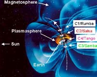 Paris (ESA) Sep 20, 2004 Published 14 July 2004, in Annales Geophysicae, a multipoint analysis of Cluster data allows, for the first time, to locate the source of non-thermal terrestrial continuum radiation by triangulation. This study also reveals the importance of small-scale density irregularities in the local amplification of these radiations, which triggers the need of more detailed generation and propagation models. Sources of Non-Thermal terrestrial Continuum radiation (NTC) have been found in the plasmapause region, by triangulation of observations from the Cluster satellites. This result is among a wealth of observational advances in the study of NTC, detailed in a recent paper published in Annales Geophysicae. The term continuum refers to radiation banded in frequency, displaying spectral stability in intensity, over a typical time scale of several hours. Over the last 30 years, NTC radiation has been observed not only in the Earth environment but also from the magnetosphere of Jupiter, Saturn, Uranus and Neptune; in other words, from all planets of our Solar system with a strong magnetic field. NTC is one of the two primary types of coherent radio emissions observed from Planetary magnetospheres. One type (for example terrestrial auroral kilometric radiation, jovian hectometric radiation) is intense and bursty, the other (NTC) weaker and long lasting. NTC results from the mode conversion of electrostatic waves to electromagnetic waves. Even if different theories of mode conversion have been proposed, the generation, the amplification and the propagation of NTC remain open questions. All these questions are linked to the source location(s) of NTC. On Cluster, NTC is observed in a variety of magnetospheric regions (Image 2). These include: the solar wind, the magnetosheath (top panel), the magnetotail (middle panel) and the inner magnetosphere (bottom panel). Past observations led to the conclusion that the source of NTC may not be unique but multiple, originating from the plasmapause region, mainly in the equatorial plane. Additionally, according to one of the two main theories of mode conversion (Jones, 1976), the magnetopause may also be a possible source region (Jones, 1987). Using the unique space fleet configuration of Cluster, the position of NTC sources have been identified, for the first time, by triangulation (see below for more information on triangulation). Each time, NTC was found originating from the plasmapause region (Image 3), but sometimes out of the equatorial plane (Image 4). "The classical view of a source placed both at the plasmapause and at the equator is ruled out", wrote Dr. P. Decreau, PI of the Cluster relaxation sounder (WHISPER**) and lead author on this research, published 14 July 2004 in Annales Geophysicae. Another interesting finding is the observation of NTC amplification in the presence of local density depletions of small size (Image 5). These observations suggest a possible role of small-scale irregularities on radiation properties of NTC, including propagation path. This finding triggers the need of more refined models. More observational advances on NTC are foreseen in the coming years, thanks to the large spacecraft separations foreseen: "Triangulation at large distance from the source would help to reduce the estimated angular dimension of the source region. Triangulation for instance from the magnetosheath is not yet possible but should be done during the future mission phases (2005 onwards), when large spacecraft separations are foreseen", Decreau added.