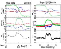 Paris, France (ESA) Jan 29, 2008 Magnetic reconnection is a universal process able to drive explosive phenomena such as solar flares. At the heart of this process is a small zone called the electron diffusion region, where reconnection is thought to be triggered. In a recent article, scientists report the first observational evidence for the overall size of this region and find that it is 300 times larger than previously thought. This means that future missions will have a much better chance of detecting and resolving this region than previously estimated, profoundly impacting mission design and scientific operations. Space is filled with plasma (an ionized gas composed of ions and electrons, globally neutral) and threaded by magnetic fields. These magnetic fields store energy, which can be explosively released in a process called magnetic reconnection. This physical process plays a key role in numerous astrophysical phenomena: star formation, solar flares and intense aurora to name a few. On Earth, it is a mechanism that can disrupt the efficient production of electricity in controlled fusion reactors. During reconnection, magnetic field lines of opposite polarity annihilate, converting magnetic energy into particle energy. The process begins in a small electron diffusion region where a kink in the newly reconnected lines produces large-scale high-velocity jets of plasma flowing outward . "Understanding the structure of the diffusion region and its role in controlling the rate at which magnetic energy is converted into particle energy remains a key scientific challenge," says Dr. Michael Shay, University of Delaware, USA. Theoreticians until very recently thought that the electron diffusion region in the Earth's magnetosphere was a 'tiny' region of width ~2 km and length ~10 km. This meant that, in the vastness of space, the chance of a spacecraft encountering this region was exceedingly small, even though already crossed and studied (e.g. Scudder et al., 2002; Mozer et al., 2003, 2005a, 2005b, Xiao et al., 2006). But as computer power has increased, theorists made their two dimensional (2-D) simulation domains larger. They then discovered unexpectedly that the electron diffusion region is much more elongated than seen in earlier simulations, a bit like stretched chewed gum (movie 1) [Shay et al., 2007; Karimabadi et al., 2007]. However, the theorists still can't tell how long this layer truly is because it continues to lengthen as the simulation box is made bigger and bigger. Is this new simulation finding real? Is such an elongated layer even stable, especially in the real 3-D world? On 14 January 2003, the four ESA/NASA Cluster satellites were crossing the magnetosheath, a turbulent plasma region located just outside the Earth's magnetosphere, when they encountered an electron diffusion region. Not only did Cluster confirm the existence of an elongated electron diffusion region (Image 1), but the length observed by Cluster is 3000 km, or 300 times longer than the earlier theoretical expectations and even four times longer than seen in recent simulations. The observations are in excellent qualitative agreement with simulations (Image 2). "These Cluster observations are very significant since they are the first measurements of the length of the electron diffusion region in the space environment. The finding drastically changes the way we understand the physics of reconnection," noted Dr. James Drake, University of Maryland, USA. "This discovery of an electron diffusion region 300 times longer than previously thought means future space missions will have a much higher probability of detecting and resolving the electron diffusion region than previously estimated," says Tai Phan, University of California at Berkeley, USA. Cluster was able to detect the electron diffusion region based on its high-resolution magnetic field, electric field and ion measurements. But to finally understand the fundamental physics of the electron diffusion region (which is ultimately responsible for reconnection), one needs to perform electron measurements with higher time resolution, capable of resolving this thin but long layer. The four spacecraft of the NASA Magnetospheric Multi-Scale mission (MMS) are being designed to make such measurements. This mission is planned for launch in 2014. Following MMS is a mission called Cross-Scale, which comprises 12 spacecraft to simultaneously watch the diffusion region and measure the global consequences of energy released by reconnection. Cross-Scale is currently under study at ESA in collaboration with other space agencies as part of a competitive selection process for the mid-2017 launch slot in ESA's science programme "Cosmic Vision 2015-2025". "With a much higher probability of encountering the electron diffusion region, we can be confident that these future missions will be able to grasp a full understanding of the magnetic reconnection phenomenon," says Philippe Escoubet, Cluster and Double Star project scientist at ESA. References T. D. Phan, J. F. Drake, M. A. Shay, F. S. Mozer and J. P. Eastwood, Evidence for an elongated (> 60 ion skin depths) electron diffusion region during fast magnetic reconnection, Phys. Rev. Let., 99, 255002, doi:10.1103/PhysRevLett.99.255002, 21 December 2007 Related articles Shay, M.A., J.F. Drake and M. Swisdak, Two-Scale Structure of the Electron Dissipation Region during Collisionless Magnetic Reconnection, Phys. Rev. Let., 99, 155002, doi:10.1103/PhysRevLett.99.155002, 9 October 2007 Karimabadi, H. , W. Daughton and J. Scudder, Multi-scale structure of the electron diffusion region, Geophys. Res. Let., 34, L13104, doi:10.1029/2007GL030306, 11 July 2007 Scudder, J.D. et al., Fingerprints of collisionless reconnection at the separator, I, Ambipolar-Hall signatures, J. Geophys. Res., 107, A10, 1294, doi: 10.1029/2001JA000126, 15 October 2002 Mozer, F.S., S.D. Bale, J.P. McFadden and R.B. Torbert, New features of electron diffusion reg