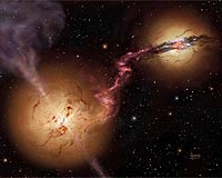 London, UK (SPX) Oct 17, 2008 New observations made with the Submillimeter Array of telescopes in Hawaii suggest that black holes - thought to exist in many, if not all, galaxies - were common even in the early Universe, when galaxies were just beginning to form. Astronomers have found two very different galaxies in the distant Universe, both with colossal black holes at their heart, involved in a spectacular collision. 4C60.07 - the first of the galaxies to be discovered - came to astronomers' attention because of its bright radio emission. This radio signature is one telltale sign of a quasar - a black hole, spinning rapidly, feeding on its parent galaxy. A new image captures the moment, approximately 12 billion years ago, when this galaxy ripped a stream of dusty gas from a neighbour. When 4C60.07 was first studied, astronomers thought that gas surrounding its black hole was undergoing a burst of star formation, turning virgin gas into stars at a remarkable rate - the equivalent of 5,000 of our Suns every year. This prodigious activity was revealed by the infrared glow from smoky debris in which the largest stars rapidly die. The latest research, exploiting the keen vision possible with the Submillimeter Array, revealed a surprise: 4C60.07 is not forming stars after all. Indeed, its stars may well be relatively old and quiescent. Instead, the prodigious star formation is taking place in a previously unknown companion galaxy, which is rich in gas and deeply enshrouded in dust, and has another colossal black hole glowing as its centre. "This new image reveals two galaxies where we only expected to find one," said Professor Rob Ivison at the Science and Technology Facilities Council's UK Astronomy Technology Centre in Edinburgh, lead author of the study that will be published in the Monthly Notices of the Royal Astronomical Society. "Remarkably, both galaxies contain super-massive black holes, each capable of powering a billion, billion, billion light bulbs. The implications are wide reaching: you can't help wondering how many other colossal black holes may be lurking unseen in the distant Universe?" "It seems we were led to pluck the radio galaxy and its neighbour from the countless millions of objects in the sky because they are involved in a rare collision." Due to the finite speed of light, we see the two galaxies as they collided in the distant past, less than 2 billion years after the Big Bang. By now the galaxies will have merged to create a football-shaped elliptical galaxy. Their black holes are likely to have merged to form a single monstrously large black hole. "The superb resolution of the Submillimeter Array was key to our discovery," said Steve Willner of the Harvard-Smithsonian Center for Astrophysics, a co-author of the paper. "These two galaxies are fraternal twins. Both are about the size of the Milky Way, but each one is unique." Dr Glenn Morrison, an astronomer at the Institute for Astronomy and the Canada-France-Hawaii Telescope in Hawaii, added "Understanding the prevalence of black holes in the early years of the Universe will rely on combining information from across the whole electromagnetic spectrum". Professor Ian Smail at Durham University said "The UK's revolutionary new submillimetre camera, SCUBA2, should find many more of these distant starbursts when it is commissioned later this year - allowing us to track the growth of black holes and their host galaxies in much more detail". Community Email This Article Comment On This Article Share This Article With Planet Earth
