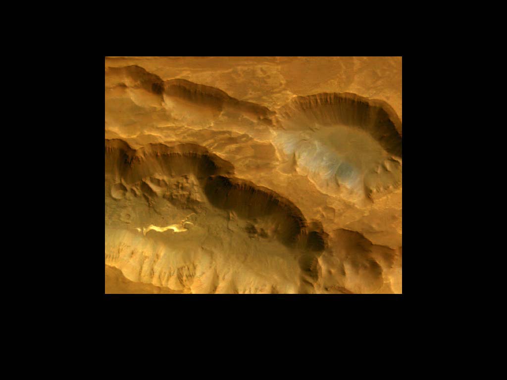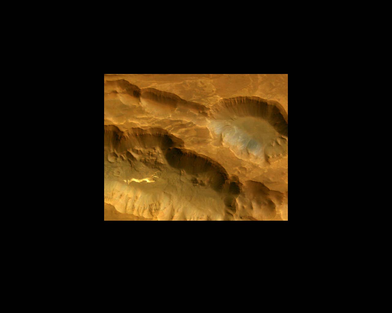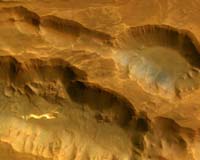 Paris (ESA) Nov 18, 2004 This image, taken by the High Resolution Stereo Camera (HRSC) on board ESA's Mars Express spacecraft, shows the detailed structure of Coprates Catena, a southern part of the Valles Marineris canyon system on Mars. The image was taken during orbit 438 with a ground resolution of approximately 43 metres per pixel. The displayed region covers an area centred at about latitude 14� South and longitude 301� East. Coprates Catena is a chain of collapsed structures, which run parallel to the main valley Coprates Chasma. These collapsed structures vary between 2500 and 3000 metres deep, which is far less than the depth of the main valley at 8000 metres. A few landslides can be seen on the valley walls. The valley chains have no connection to the lowland plains as compared to the main valleys. This indicates that their origin is solely due to the expansion of the surface, or collapse, with removal of underlying material (possibly water or ice). On the valley floor, brighter layers are exposed, which could be material of the same composition as seen in other parts of Valles Marineris, where sulphates have been measured by the OMEGA spectrometer instrument on board Mars Express. Image resolution has been decreased for use on the internet. The colour images were processed using the HRSC nadir (vertical view) and three colour channels. Community Email This Article Comment On This Article Related Links Mars Express at ESA SpaceDaily Search SpaceDaily Subscribe To SpaceDaily Express Mars News and Information at MarsDaily.com Lunar Dreams and more