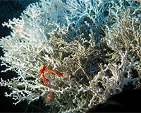 Den Haag, Netherlands (SPX) Nov 10, 2008 Imagine descending in a submarine to the ice-cold, ink-black depths of the ocean, 800 metres under the surface of the Atlantic. Here the tops of the hills are covered in large coral reefs. NIOZ-researcher Furu Mienis studied the formation of these unknown cold-water relatives of the better-known tropical corals. Furu Mienis studied the development of carbonate mounds dominated by cold-water corals in the Atlantic Ocean at depths of six hundred to a thousand metres. These reefs can be found along the eastern continental slope from Morocco to Norway, on the Mid-Atlantic Ridge and on the western continental slope along the east coast of Canada and the United States. Mienis studied the area to the west of Ireland along the edges of the Rockall Trough. In her research Mienis analysed environmental factors like temperature, current speed and flow direction of seawater as these determine the growth of cold-water corals and the carbonate mounds. The measurements were made using bottom landers, observatories placed on the seabed from the NIOZ oceanographic research vessel 'Pelagia' and brought back to the surface a year later.
