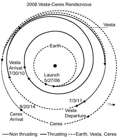 Los Angeles - Aug 26, 2003 The Dawn mission is presently in the formulation phase, preparing to demonstrate at its Preliminary Design Review (PDR) that it is ready to proceed with the implementation phase. As part of the preparation for PDR, design reviews of four of the five scientific instruments have been completed, (Visible and Infrared Mapping Spectrometer - VIR; Gamma Ray and Neutron Detector - GraND; magnetometer, and laser altimeter). All instruments passed their reviews with flying colors. The review of the fifth instrument, the framing camera, will take place in September. Much of the work on the camera will now take place at the Max Planck Institut fur Aeronomie (MPAe) in Katlenburg-Lindau. In conjunction with the new division of labor, Dawn welcomes two new members from MPAe to its science team, Uwe Keller, who will lead the camera development and Uli Christensen, MPAe Director, who will assist with the science planning and analysis. This summer we also completed testing of the solar cells that will power the Dawn spacecraft and its ion propulsion system. Mission success depends greatly on the efficiency of these cells. When the spacecraft journeys away from the Sun, the illumination drops and the arrays cool. The cooler arrays are more efficient, compensating somewhat for the drop in illumination, but the combined effects have not previously been well characterized. Since most outer solar system missions have used radioactive thermal generators, the data on this low intensity, low temperature effect (LILT) is sparse. Fortunately, our LILT testing confirmed the efficiencies that were assumed when Dawn was proposed to NASA. The project opted to add a fifth solar panel to each wing to increase Dawn's power margin at Ceres (at which time the spacecraft could reach 2.9 AU). The project has also been asked to increase its financial reserve, necessitating other mission trades and descopes. Since the mission is well along in its design phase, there are limited options to do this. Our optimized solution to meet this challenge is to launch on a standard Delta 2925, rather than a heavy, using Mars for a gravity assist. This mission plan also provides much needed calibration data for the instruments, and an early test of the science operations and data analysis systems. There will be some delay in arrival at Vesta but the very interesting southern polar region will still be illuminated. After acquiring its Vesta observations, the spacecraft departs for Ceres. This plan requires some rephasing of the budget profile and has not yet been approved by NASA HQ, but we are hoping and expecting it will, and that Dawn will move into the implementation phase late in the calendar year.