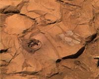 Pasadena CA (JPL) Aug 30, 2004 At a rock called "Clovis," the rock abrasion tool on NASA�s Mars Exploration Rover Spirit cut a 9-millimeter (0.35-inch) hole during the rover's 216th martian day, or sol (Aug. 11, 2004). The hole is the deepest drilled in a rock on Mars so far. This approximately true-color view was made from images taken by Spirit's panoramic camera on sol 226 (Aug. 21, 2004) at around 12:50 p.m. local true solar time - early afternoon in Gusev Crater on Mars. To the right is a "brush flower" of circles produced by scrubbing the surface of the rock with the abrasion tool's wire brush. Scientists used rover's Moessbauer spectrometer and alpha particle X-ray spectrometer to look for iron-bearing minerals and determine the elemental chemical composition of the rock. This composite combines images taken with the camera's 600-, 530- and 480-nanometer filters. The diameter of the hole cut into the rock is 4.5 centimeters (1.8 inches). Community Email This Article Comment On This Article Related Links Mars Rovers at JPL Mars Rovers at Cornell SpaceDaily Search SpaceDaily Subscribe To SpaceDaily Express Mars News and Information at MarsDaily.com Lunar Dreams and more