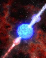 Socorro - Nov 11, 2003 A Fourth of July fireworks display features bright explosions that light the sky with different colors, yet all have the same cause. They just put their explosive energy into different colors of light. Similarly, astronomers have discovered, a variety of bright cosmic explosions all have the same origin and the same amount of total energy. This is the conclusion of an international team of astronomers that used the National Science Foundation's Very Large Array (VLA) radio telescope to study the closest known gamma-ray burst earlier this year. "For some reason we don't yet understand, these explosions put greatly varying percentages of their explosive energy into the gamma-ray portion of their output," said Dale Frail, of the National Radio Astronomy Observatory (NRAO) in Socorro, NM. That means, he said, that both strong and weak gamma-ray bursts, along with X-ray flashes, which emit almost no gamma rays, are just different forms of the same cosmic beast. The research team reported their results in the November 13 issue of the scientific journal Nature. The scientists trained the VLA on a gamma-ray burst discovered using NASA's HETE-2 satellite last March 29. This burst, dubbed GRB 030329, was the closest such burst yet seen, about 2.6 billion light-years from Earth. Because of this relative proximity, the burst was bright, with visible light from its explosion reaching a level that could be seen in amateur telescopes. As the burst faded, astronomers noted an underlying distinctive signature of a supernova explosion, confirming that the event was associated with the death of a massive star. Since 1999, astronomers have known that the strong outbursts of gamma rays, X-rays, visible light and radio waves from these bursts form beams, like those from a flashlight, rather than spreading in all directions, like light from a bare bulb. The surprising result from the VLA studies of GRB 030329 is that there are two beams, not one. The scientists found that the gamma rays and the early visible-light and X-ray emission were coming from a narrow beam, while the radio waves and later visible-light emission came from another, wider beam. "The strange thing is that some explosions seem to put most of their energy into the narrow beam, while others put most or nearly all their energy into the wider beam," Frail said. "This is telling us something very fundamental about the inner workings that drive these explosions," Frail added. The mechanism producing these explosions is what scientists call a collapsar, which occurs when a giant star collapses of its own weight at the end of its normal, nuclear fusion-powered lifetime. In an ordinary supernova, such a collapse produces a neutron star. A collapsar, however, marks the death of a more-massive star and results in a black hole, a concentration of mass so dense that not even light can escape it. After the black hole forms, its powerful gravitational pull sucks the star's remaining material toward it. This material forms a spinning disk around the black hole that lasts only a few seconds. During that time, the disk ejects material outward from its poles. A jet of material moving at nearly the speed of light emits gamma rays; slower material emits radio waves and visible light. "Despite the differences in how much energy comes out in gamma rays, all these things seem to be caused by the same basic mechanism," said Edo Berger, a graduate student at Caltech and lead author of the Nature paper. "Our observations now give the data that will help us understand what causes the differences," he added. "It was astounding to suddenly realize that these apparently very different cosmic beasts all are really the same thing," said Berger. The next job, Frail said, is to learn if there are, in fact, two jets, or a single jet in which the central part encounters less resistance and thus can move outward at greater speeds. Frail pointed out that the radio observations alone had the ability to show the total energy output of the burst, thus providing the breakthrough in understanding the common thread among the different types of explosions. "The key fact is that the optical, X-Ray and gamma-ray telescopes missed 90 percent of the energy put out by this burst," Frail added. "As the VLA Expansion Project progresses and the sensitivity of the VLA improves in the coming years, it will become an even more important tool in unravelling this mystery," Frail said. "The exciting part of this new discovery is that explosions that we once thought were quite different now appear to all have a common origin," Frail concluded. "That insight, of course, gives us the new challenge of explaining how a single mechanism can make itself look so different," he added. In addition to Berger and Frail, the other authors of the paper are Professor Shri Kulkarni of Caltech; Guy Pooley of Cambridge University's Mullard Radio Astronomy Observatory; Vince McIntyre and Robin Wark, both of the Australia Telescope National Facility; Re'em Sari, associate professor of astrophysics and planetary science at Caltech; Derek Fox, a postdoctoral scholar in astronomy at Caltech; Alicia Soderberg, a graduate student in astrophysics at Caltech; Sarah Yost, a graduate student in physics at Caltech; and Paul Price, a postdoctoral scholar at the University of Hawaii's Institute for Astronomy. Berger and Soderberg earlier worked on gamma-ray-burst studies as summer students at NRAO. Community Email This Article Comment On This Article Related Links National Radio Astronomy Observatory SpaceDaily Search SpaceDaily Subscribe To SpaceDaily Express Nuclear Space Technology at Space-Travel.com