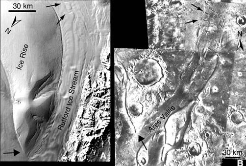 Flagstaff - Jan. 17, 2001 Some channels visible on the surface of Mars may have been gouged by ice, rather than by catastrophic flooding, as is generally believed. That is the view of Dr. Baerbel K. Lucchitta of the U.S. Geological Survey in Flagstaff, Arizona, who compared the Martian features with strikingly similar ones on the Antarctic sea floor. Her findings are reported in the February 1 issue of Geophysical Research Letters, a publication of the American Geophysical Union. Outflow channels on Mars may be tens of kilometers [miles] wide and hundreds of kilometers [miles] long, as are some that Lucchitta studied in Antarctica. Ice flows in streams within Antarctica's ice sheets before merging with ice shelves in the surrounding ocean; the ones she studied flow from West Antarctica into the Ross and Ronne Ice Shelves. The martian channels arise suddenly from chaotic terrains or fractures and terminate in the northern plains, where there may once have been an ocean. Both the Antarctic ice streams and some martian channels are based below sea level, which on Mars is defined as the average surface elevation of the hypothetical ancient northern plains ocean. The Antarctic channels were mapped using recently available sonar imagery. Lucchitta demonstrates that martian channels, especially one known as Kasei Valles, display similar characteristics to those of Antarctic channels known to have been carved by ice streams. She compares the Rutford Ice Stream at its confluence with the Ronne Ice Shelf, where it diverges around an ice rise, formed of more stable ice than the adjacent flow, with Ares Vallis. The latter diverges around an island and displays similar curved flow lines where it enters the hypothetical ocean. The configuration of these two streams is identical, she writes. Lucchitta infers that Ares Vallis was filled by material that had the characteristics of flowing ice that entered an ice covered body of water. She believes that dust covered ice may persist in Ares Vallis or that rocky material left an expression of the flow forms after the ice evaporated. "The observations strongly support the notion that an ocean once existed in the northern plains of Mars," she says. Another similarity between Antarctica and Mars noted in the study is that some streams and channels rise in altitude in the downstream direction. On Earth, uphill flow at the base of ice is common, because the surface gradient drives the ice, whereas water does not flow uphill for extended distances. There are differences between Antarctica and Mars regarding the origin of ice in ice streams. On Earth, the streams flow from ice sheets, while on Mars, it derived from fluids erupting from below the surface. Also, on Earth, the ice flows between ice walls, while on Mars it flowed between rock walls, but the width to depth ratio on Mars is more like that of ice streams than of mountain glaciers on Earth, Lucchitta notes. Community Email This Article Comment On This Article Related Links Additional images and data SpaceDaily Search SpaceDaily Subscribe To SpaceDaily Express Mars News and Information at MarsDaily.com Lunar Dreams and more
