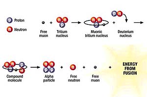 Muon-catalysed fusion has faced two big hurdles. Now an international team has cracked one of these, with a nifty way to bump up the number of nuclear reactions each muon achieves before it decays. Meanwhile, a group of Japanese physicists is making progress on the other. The muon aids fusion by first replacing an electron orbiting around a tritium nucleus--a heavy isotope of hydrogen--forming muonic tritium. If a deuterium nucleus is added, this creates a compound molecule. The muon, now orbiting the whole compound molecule, squeezes the two nuclei closer together until they fuse and become a helium nucleus, otherwise known as an alpha particle (click on thumbnail graphic for Diagram). Because the muon does the squeezing, there is no need for high temperatures and pressures. The researchers are reluctant to use the name "cold fusion" for their technique. "But it's colder than anything else going," says team leader Glen Marshall of the TRIUMF particle physics lab in Vancouver, British Columbia. In order to get a decent yield, the energy of the muonic tritium must be kept very low, about 1 electronvolt (eV), as it approaches the deuterium nuclei. In earlier work, researchers had used a scattergun approach, firing particles with different energies at a deuterium target. But Marshall's team discovered that muonic tritium escapes from a tritium-hydrogen mixture when its energy is about 1 eV. "That was a coincidental discovery," admits Marshall. "We used that fact to select atoms with the right kind of energy." The researchers fired their beam of 1 eV muonic tritium at concentrated deuterium condensed onto gold foil, and chilled the whole set-up to 3 kelvin. When they measured the number of fusions per muon by detecting the alpha particles produced, they clocked up a rate a hundred times as high as the scattergun approach. "It's a very interesting and important step," says Ken Nagamine at the Japanese Institute of Physics and Chemical Research (RIKEN) in Wako-shi. Nagamine's team is currently working on the other problem dogging muon fusion. In a reactor core each muon must catalyse about 300 fusions before its natural lifetime expires. The trouble is, the negatively charged muon tends to stick to the positive alpha particle at the end of the reaction. Nagamine says that the muon can break free under the right conditions. "We have discovered a process of high energy recoil of products which can strip the muon from the alpha particle." Source: Physics Review Letters (vol 85, p1674) This article appeared in the September 2 issue of New Scientist New Scientist. Copyright 2000 - All rights reserved. The material on this page is provided by New Scientist and may not be published, broadcast, rewritten or redistributed without written authorization from New Scientist. CommunityEmail This Article Comment On This Article Related Links Space