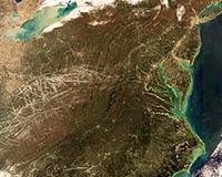 Paris (ESA) Nov 28, 2005 Aircraft condensation trails or 'contrails' are clearly visible slicing across the East Coast of the United States in this Envisat image. The image stretches south from the US-Canadian border down to the Appalachian Mountains and east from Ohio to New York, New Jersey, Delaware and Maryland. A dense collection of the straight clouds called contrails is seen between the cities of Cincinnati, Columbus and Pittsburgh. Exhaust emissions from jet aircraft contain large amounts of water vapour which, under certain atmospheric states, will condense to form ice crystals. These act as condensation nuclei around which even more water vapour in the surrounding air condenses. The end result is the formation of an elongated cloud-like condensation trail in the sky. Contrails could potentially have an impact on the Earth's climate, especially as they often spread out to form persistent artificial cirrus clouds which would not otherwise have existed. As part of ESA's Data User Element, the Agency is working on a project called CONTRAILS to develop a satellite-based service to monitor daily contrail and cirrus cloud production over Europe and the North Atlantic, some of the busiest airspace in the world. The project concludes at the end of this year, with the results of its detailed assessment of the greenhouse impact of aviation-induced contrails being due in 2006. Towards the top of the image on the US-Canadian border is Lake Erie, the smallest of the five Great Lakes of North America by volume. It is also the shallowest of the Great Lakes, with an average depth of 19 metres. Its milky white colour could be due to elevated levels of calcium carbonate sediments in the water. Note also the tint of the water along the Atlantic coast, particularly around Delaware midway up the image, and New York's finger-shaped Long Island further north. This is due to sediments from river discharge as well as algae blooms. This image was acquired by Envisat's Medium Resolution Imaging Spectrometer (MERIS) on 19 November 2005, working in Reduced Resolution mode to deliver spatial resolution of 1200 metres. The image has a width of 1135 kilometres. Community Email This Article Comment On This Article Related Links Envisat at ESA SpaceDaily Search SpaceDaily Subscribe To SpaceDaily Express Earth Observation News - Suppiliers, Technology and Application