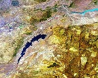 Paris (ESA) Aug 15, 2005 The 20th century was the great age of dam building, which did more than any other single human activity to change the face of our planet. Lake Kariba was created in the late 1950s by the construction of a largest dam wall across the Zambezi River running through the Kariba Gorge. More than a million cubic metres of concrete were employed to build the 24-metre thick and 36.6-metre high wall, which was designed to sustain the pressure of nearly ten million litres of water passing through its spillway every second. It is located at the northernmost shore of Lake Kariba. Jointly owned by the governments of Zambia and Zimbabwe, the dam was constructed to supply hydroelectric power to the then-British colonies, but today is also significant for fishing and recreational uses. Maximum water level was reached in 1963, some 700 animals being saved from floodwaters by a rescue operation called Operation Noah. Today Lake Kariba is one of the largest dams in the world, with a surface area of 5580 square kilometres and an average depth of 29 metres, increasing to a maximum of 97 metres. It is 220 km long and in places up to 40 kilometres wide. Its waters support more than 40 different species of fish � including the sardine-like kapenta, a protein-rich fish around which a local fishing industry has developed. In a rare example of a successful introduction of a non-native species to a lake, the kapenta - taken from Lake Tanganyika - has apparently had a minimal biological impact. Also present are hippo and crocodile, with elephant, buffalo, rhino and smaller animals abundant in the surrounding valley. North of the eastern side of Lake Kariba is the Zambian capital of Lusaka, visible as a whitish area. Northwest of Lusaka is a noticeable square-marked grey feature which is the Lukanga Swamps, an ecologically important wetland region. Over on the Zimbabwean shoreline is located Matusadona National Park � a notable safari park and home to endangered Black Rhinos - while above it in the Chizarira Hills is found the remote Chizarira National Park. Follow the Zambesi River east to find another narrow lake, apparently shallower from its light-blue colour: this is Mozambique's 270-km-long Lago de Cahora Bassa (Cahora Basin Reservoir), which was dammed in the 1970s. The Medium Resolution Imaging Spectrometer (MERIS) acquired this image on 6 June 2005, operating in Full Resolution mode with a spatial resolution of 300 metres. It covers an area of 672 by 672 kilometres. CommunityEmail This Article Comment On This Article Related Links SpaceDaily Search SpaceDaily Subscribe To SpaceDaily Express Earth Observation News - Suppiliers, Technology and Application