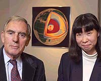 Los Angeles - Oct 13, 2002 An odd, previously unknown sphere, some 360 miles in diameter, has been found at the bottom of the Earth. It was detected by a Harvard professor and a graduate student who patiently examined records of hundreds of thousands of earthquake waves that passed through the center of the planet in the past 30 years. "It may be the oldest fossil left from the formation of Earth," says Adam Dziewonski, Frank B. Baird Jr. Professor of Science. "Its origin remains unknown, but its presence could change our basic ideas about the origin and history of the planet." Earth's center lies some 3,800 miles below our feet. Continents and oceans make up only a thin crust that extends about 20 miles down. Below them lies a huge, 1,800-mile-thick layer known as the mantle. Slowly moving currents of rock in the mantle cause continents to drift and the edges of the ocean floors to sink into huge trenches. The mantle encloses a core 2,100 miles in radius, blistering hot and made mostly of iron. The outer core is liquid, the inner core is solid. That's the way Earth has been depicted in textbooks for the past 66 years. But the work of Dziewonski and graduate student Miaki Ishii shows that this picture doesn't get to the bottom of things. Engulfed in the inner core, like a pit in a peach, lies a 360-mile-wide inner inner core. This core within a core within a core makes up one ten-thousandth of the Earth's volume. The inner core itself wasn't discovered until 1936. Thirty- five years went by before Dziewonski and geophysicist Freeman Gilbert proved that it was a solid enclosed in a liquid. (It doesn't melt because of millions of pounds of pressure pressing down on each square inch of its surface.) Now, a careful study of how the speed of earthquake waves changes with the direction they take reveals that the innermost part of the inner core is obviously different from the rest of it. Dziewonski and Ishii have published their results in the Oct. 1 issue of the Proceedings of the National Academy of Sciences. Ironing out differences The inner core, 1,440 miles in diameter and heated to a blistering 5,000 degrees, has puzzled earth scientists since it was discovered. In the early 1980s, researchers found earthquake waves traveling parallel to the axis of Earth's rotation, roughly north-south, went through the inner core faster than did waves traveling along the equatorial plane, or east-west. The discrepancy went unexplained until 1986 when Harvard investigators, including Dziewonski, showed it was due to a phenomenon known as "anisotropy." Within mineral crystals that make up the core, molecules and atoms can be spaced differently when looked at in different directions. Earthquake waves travel faster through closely packed molecules and atoms than through those with more space between them. If packing is tighter in the north-south directions, earthquake waves will zip through the core faster than they would in the east-west direction. Anisotropy explained much but not all of changes seen in the travel of earthquake waves. In trying to completely close the gap "things got a little wild," Dziewonski recalls. Some people denied that anisotropy exists at all, others said that part of the inner core is isotropic and part is anisotropic, yet others -- including Dziewonski for a while -- believed that the inner core rotated at a Sdifferent rate from the rest of Earth. Because earthquake waves pass through the crust, mantle, and outer core on the way in to the center and on the way out, this introduces all kinds of complexities in trying to puzzle out their paths. "The inner core seemed to be the container for all the ignorance we had about the rest of the Earth," Dziewonski comments. To get the closet look yet into that container, Miaki Ishii and Dziewonski analyzed 30 years of data that covered several million records of the travels of earthquake waves. About 325,000 of them passed through the inner core. At first they saw no change: The inner core looked about the same from top to bottom. Then they took a shaper look at more than 3,000 waves that traveled closest to Earth's center. They found an obvious change in anisotropy, or wave speed with direction, in an area 360 miles in diameter surrounding the very bottom of the world. "It's a very robust effect," they insist. In the innermost inner core waves travel most slowly at a 45 degree angle to Earth's axis, as opposed to an east-west direction in the rest of the inner core How did it form? Dziewonski speculates that this innermost iron ball may be a leftover from the original kernel out of which Earth separated into crust, mantle, and core some 4.6 billion years ago. Through subsequent years of meteoric bombardments and geological upheavals, including the ripping off of a big chunk to make the moon, the innermost core survived. If so, it is the oldest unaltered part of our planet. However, other possibilities exist, albeit not as exciting. Most earth scientists believe the inner core is growing at the expense of the outer core. The solid iron sphere sits in the path of jets and currents roiling the outer core fluids like a big rock in a flowing stream. These patterns of flow might have been altered after the inner core reached a diameter of 360 miles. Afterwards, iron crystals deposited on the inner core surface in a different orientation, creating a different kind of anisotropy. A third possibility is that at the higher pressure and temperature near the planet's center, iron crystals pack differently. The change in packing pattern could alter the directions of fast and slow speeds traveled by earthquake waves. Whatever the explanation, Dziewonski and Ishii expect a lot of heat from their colleagues. "The idea of a new region in Earth will generate quite a bit of controversy," Dziewonski says. That's probably a huge understatement. Two of the leading scientific journals rejected the study's conclusions before the Proceedings of the National Acad