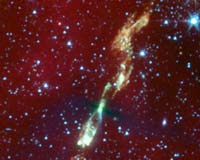 Pasadena CA (JPL) Nov 30, 2007 A developing star wrapped in a black cocoon of dust is seen sprouting giant jets in a new image from NASA's Spitzer Space Telescope. The stellar portrait, captured in infrared light, offers the first glimpse at a very early stage in the life of an embryonic sun-like star -- a time when the star's natal envelope is beginning to flatten and collapse, and streams of gas are escaping. The observations will ultimately help astronomers better understand how stars and their planets form. "This is the first time we've clearly seen a flattened envelope around a forming star," said Leslie Looney of the University of Illinois at Urbana-Champaign, lead author of a study about the star, called L1157, appearing Dec. 1 in Astrophysical Journal Letters. "Some theories had predicted that envelopes flatten as they collapse onto their stars and surrounding planet-forming disks, but we hadn't seen any strong evidence of this until now." Stars are born out of thick clouds, or envelopes, of gas and dust that condense and collapse inward. As a star grows and feeds off the envelope, it spins faster and faster like a twirling ice skater. A disk of planet-forming material begins to take shape in orbit around the star, and jets of gas shoot up from above and below the disk to relieve the star's accumulating pressure. Eventually, the original envelope falls onto the spinning disk, and the jets slow to a stop. The regions where all the action takes place are dark and dusty, letting little visible light escape. For example, the embryonic star L1157 appears black in visible-light views. Spitzer's infrared view of the star, on the other hand, penetrates the dusty haze, giving us a rare look at what our own solar system might have looked like when it was very young. The bipolar jets shooting away from L1157 are enormous; light itself would take about nine months to travel the length of one jet. The color white shows the hottest parts of the jets, with temperatures around 100 degrees Celsius (212 degrees Fahrenheit). Most of the material in the jets, seen in orange, is roughly zero degrees on the Celsius and Fahrenheit scales. The flattened envelope around the fledgling star is perpendicular to the jets and appears deep black. This is because it is so thick with dust that even infrared light cannot escape. The envelope is big enough to engulf the equivalent of tens of thousands of mature solar systems similar to our own, while the planet-forming disk tucked inside cannot be seen in this photo - it is smaller than a pixel. L1157 is located about 800 light-years away in the constellation Cepheus. It is roughly 10,000 years old, and, according to astronomers' estimates, will ignite to become a full-fledged star about the mass of our sun in a million years or so. "Taking baby pictures of stars is not easy to do," said Looney. "Now that we have a good picture, we can begin to ask questions about whether this star system and its potential planets will grow up to become like ours." Other authors of this study include John J. Tobin of the University of Michigan, Ann Arbor, and Woojin Kwon of the University of Illinois. Community Email This Article Comment On This Article Related Links Stellar Chemistry, The Universe And All Within It