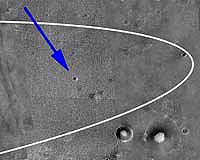 Moffett Field - Feb 16, 2004 "As you saw with Spirit," said Tim McElrath of the Opportunity's navigation team, "we have a number ways to locate a rover. The 44 by 5 miles across, that error ellipse was what we worked for six months to define before landing. We were fortunate to have two Deep Space Network tracking stations, so we could see two-way Doppler data all the way down during descent until the parachute opened. " "This narrowed the ellipse quite alot," said McElrath. "A 145 foot by 3 foot ellipse could be defined from two Odyssey passes over many sols. That is from the inertial solution, which tracks the rover's motion. That map could be off by about a quarter mile, but we did better than that by about 500 feet." "It is like the global position system (GPS) tells you from orbit your location [in coordinates], but not your street corner." "There is a second way we determine the position of the rover," said Dr. Andrew Johnson. "This is using EDL [entry, descent and landing] telemetry. There are 3 images from the path [trajectory] toward the ground. We moved from east, to when we cut the [spacecraft's connecting] bridle, when we were moving north. "Twenty-six bounces is the official number of bounces," said Johnson. "Finally we somehow, miraculously ended up in the crater. It was like the crater had some magical force attracting us. [After first airbag impact], there was a 1/8th mile roll for more than one minute. Our velocity was 9 meters per second (20 miles per hour) north." The surface bounce pattern has been compared previously to a golfer's hole-in-one, with the cup as the small crater that currently houses the rover. When first presented with the bounce data, JPL's Jeff Parker shook his head, "How many golfers out there?" "The third way we locate the rover is by feature maps," said Parker. "This includes descent images [DIMES], the Mars Orbital Camera [MOC] on the Mars Global Surveyor [MGS], and reconstruction to [images of] three craters on the horizon. One [crater] was visible from the pre-standup "mission-success" pan, and two visible post stand-up." "This was a diffult localization," said Parker, referring to what engineers call a 'solution' when narrowed to exact coordinates, "because the crater is so small, we can't make out features from the [crater] rim to distinguish it [from others in the orbital pictures]." "The radio tracking solution," concluded Parker, "was down to 120 feet ellipse from the DIMES image." The clinching data proved to be available from orbit. "I have a camera in orbit," said Dr. Michael Malin, of Malin Space Systems who designed and operates the Mars Orbital Camera on board the Mars Global Surveyor. "It flies over the landing site twice a day, once in the morning and once later each day." "The camera has 1.5 meter per pixel resolution," said Malin, and "using the spacecraft to help, super-resolution of 0.5 meters/pixel. That is 50 centimeters." The camera operates from 400 kilometers overhead. Presenting remarkable images that document the various stages of the MER mission, Malin highlighted various pieces of hardware now on the surface. "We see where the heat shield hit, the plume from when the retro rocket fired. Finally where the back shell and parachute hit." "This is a picture of the vehicle," said Malin, referring to a bright spot. "One thing to note is how big it is relative to the crater. It fills the size of the crater." "I believe we are seeing the rover, but it is dark with solar panels," said Malin, "so it may be a 'noise bit' but we'll know when we move. If that dark spot stays the same on the next camera pass, we'll know." Malin pointed out that the combination of orbital and surface imagery was important. "The navigation camera showed a view of the backshell and parachute from the lander." "The pancam [on the rover] has taken a picture of this, as it is quite an evocative image. From the rover, outside the low rim of the crater, it is quite a pretty picture, showing over this vast, flat surface, there is the hardware we have littered the surface with." Article is courtesy of NASA's Astrobiology Magazine team at Ames Research Center. This article is public domain and available for reprint with appropriate credit. Community Email This Article Comment On This Article Related Links SpaceDaily Search SpaceDaily Subscribe To SpaceDaily Express Mars News and Information at MarsDaily.com Lunar Dreams and more