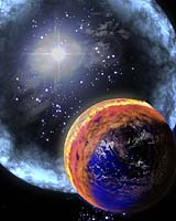 Lawrence KS (SPX) Apr 07, 2005 Scientists at NASA and the University of Kansas say that a mass extinction on Earth hundreds of millions of years ago could have been triggered by a star explosion called a gamma-ray burst. The scientists do not have direct evidence that such a burst activated the ancient extinction. The strength of their work is their atmospheric modeling - essentially a "what if" scenario. The scientists calculated that gamma-ray radiation from a relatively nearby star explosion, hitting the Earth for only ten seconds, could deplete up to half of the atmosphere's protective ozone layer. Recovery could take at least five years. With the ozone layer damaged, ultraviolet radiation from the Sun could kill much of the life on land and near the surface of oceans and lakes, and disrupt the food chain. Gamma-ray bursts in our Milky Way galaxy are indeed rare, but the scientists estimate that at least one nearby likely hit the Earth in the past billion years. Life on Earth is thought to have appeared at least 3.5 billion years ago. This research, supported by a NASA astrobiology grant, represents a thorough analysis of the "mass extinction" hypothesis first announced by members of this science team in September 2003. "A gamma-ray burst originating within 6,000 light years from Earth would have a devastating effect on life," said Dr. Adrian Melott of the Department of Physics and Astronomy at the University of Kansas, Lawrence. "We don't know exactly when one came, but we're rather sure it did come - and left its mark. What's most surprising is that just a 10-second burst can cause years of devastating ozone damage," Melott added. A scientific paper describing this finding appears in Astrophysical Journal Letters. The lead author is Brian Thomas, a Ph.D. candidate at University of Kansas. Gamma-ray bursts are the most powerful explosions known. Most originate in distant galaxies, and a large percentage likely arise from explosions of stars over 15 times more massive than our Sun. A burst creates two oppositely-directed beams of gamma rays that race off into space. Thomas says that a gamma-ray burst may have caused the Ordovician extinction 450 million years ago, killing 60 percent of all marine invertebrates. Life was largely confined to the sea, although there is evidence of primitive land plants during this period In the new work, the team used detailed computer models to calculate the effects of a nearby gamma-ray burst on the atmosphere and the consequences for life. Thomas, with Dr. Charles Jackman of NASA's Goddard Space Flight Center in Greenbelt, Md., calculated the effect of a nearby gamma-ray burst on the Earth's atmosphere. Gamma-rays, a high-energy form of light, can break molecular nitrogen (N2) into nitrogen atoms, which react with molecular oxygen (O2) to form nitric oxide (NO). NO will destroy ozone (O3) and produce nitrogen dioxide (NO2). NO2 will then react with atomic oxygen to reform NO. More NO means more ozone destruction. Computer models show that up to half the ozone layer is destroyed within weeks. Five years on, at least 10 percent is still destroyed. Next,researchers calculated the effect of ultraviolet radiation on life. Deep-sea creatures living several feet below water would be protected. Surface-dwelling plankton and other life near the surface, however, would not survive. Plankton is the foundation of the marine food chain. Dr. Bruce Lieberman, a paleontologist at the University of Kansas, originated the idea that a gamma-ray burst specifically could have caused the great Ordovician extinction, 200 million years before the dinosaurs. An ice age is thought to have caused this extinction. However, gamma-ray burst could have caused a fast die-out early on and also could have triggered the significant drop in surface temperature on Earth. "One unknown variable is the rate of local gamma-ray bursts," Thomas said. "The bursts we detect today originated far away billions of years ago, before the Earth formed. Among the billions of stars in our Galaxy, there's a good chance that a massive one relatively nearby exploded and sent gamma rays our way," he added. The Swift mission, launched in November 2004, will help determine recent burst rates. Community Email This Article Comment On This Article Related Links University of Kansas SpaceDaily Search SpaceDaily Subscribe To SpaceDaily Express Dirt, rocks and all the stuff we stand on firmly