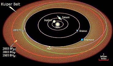 Baltimore - Sep 08, 2003 Astronomers using NASA's Hubble Space Telescope have discovered three of the faintest and smallest objects ever detected beyond Neptune. Each object is a lump of ice and rock -- roughly the size of Philadelphia -- orbiting beyond Neptune and Pluto, where the icy bodies may have dwelled since the formation of the solar system 4.5 billion years ago. They reside in a ring-shaped region called the Kuiper Belt, which houses a swarm of icy rocks that are leftover building blocks, or "planetesimals," from the solar system's creation. The results of the search were announced by a group led by astronomer Gary Bernstein of the University of Pennsylvania at today's meeting of the Division of Planetary Sciences in Monterey, Calif. The study's big surprise is that so few Kuiper Belt members were discovered. With Hubble's exquisite resolution, Bernstein and his co- workers expected to find at least 60 Kuiper Belt members as small as 10 miles (15 km) in diameter -- but only three were discovered.