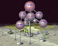 Huntsville AL (SPX) Jun 27, 2005 Opposite charges attract. Like charges repel. It's the first lesson of electromagnetism and, someday, it could save the lives of astronauts. NASA's Vision for Space Exploration calls for a return to the Moon as preparation for even longer journeys to Mars and beyond. But there's a potential showstopper: radiation. Space beyond low-Earth orbit is awash with intense radiation from the Sun and from deep galactic sources such as supernovas. Astronauts en route to the Moon and Mars are going to be exposed to this radiation, increasing their risk of getting cancer and other maladies. Finding a good shield is important. The most common way to deal with radiation is simply to physically block it, as the thick concrete around a nuclear reactor does. But making spaceships from concrete is not an option. (Interestingly, it might be possible to build a moonbase from a concrete mixture of moondust and water, if water can be found on the Moon, but that's another story.) NASA scientists are investigating many radiation-blocking materials such as aluminum, advanced plastics and liquid hydrogen. Each has its own advantages and disadvantages. Those are all physical solutions. There is another possibility, one with no physical substance but plenty of shielding power: a force field. Most of the dangerous radiation in space consists of electrically charged particles: high-speed electrons and protons from the Sun, and massive, positively charged atomic nuclei from distant supernovas. Like charges repel. So why not protect astronauts by surrounding them with a powerful electric field that has the same charge as the incoming radiation, thus deflecting the radiation away? Many experts are skeptical that electric fields can be made to protect astronauts. But Charles Buhler and John Lane, both scientists with ASRC Aerospace Corporation at NASA's Kennedy Space Center, believe it can be done. They've received support from the NASA Institute for Advanced Concepts, whose job is to fund studies of far-out ideas, to investigate the possibility of electric shields for lunar bases. "Using electric fields to repel radiation was one of the first ideas back in the 1950s, when scientists started to look at the problem of protecting astronauts from radiation," Buhler says. "They quickly dropped the idea, though, because it seemed like the high voltages needed and the awkward designs that they thought would be necessary (for example, putting the astronauts inside two concentric metal spheres) would make such an electric shield impractical." Buhler and Lane's approach is different. In their concept, a lunar base would have a half dozen or so inflatable, conductive spheres about 5 meters across mounted above the base. The spheres would then be charged up to a very high static-electrical potential: 100 megavolts or more. This voltage is very large but because there would be very little current flowing (the charge would sit statically on the spheres), not much power would be needed to maintain the charge. The spheres would be made of a thin, strong fabric (such as Vectran, which was used for the landing balloons that cushioned the impact for the Mars Exploration Rovers) and coated with a very thin layer of a conductor such as gold. The fabric spheres could be folded up for transport and then inflated by simply loading them with an electric charge; the like charges of the electrons in the gold layer repel each other and force the sphere to expand outward. Placing the spheres far overhead would reduce the danger of astronauts touching them. By carefully choosing the arrangement of the spheres, scientists can maximize their effectiveness at repelling radiation while minimizing their impact on astronauts and equipment at the ground. In some designs, in fact, the net electric field at ground level is zero, thus alleviating any potential health risks from these strong electric fields. Buhler and Lane are still searching for the best arrangement: Part of the challenge is that radiation comes as both positively and negatively charged particles. The spheres must be arranged so that the electric field is, say, negative far above the base (to repel negative particles) and positive closer to the ground (to repel the positive particles). "We've already simulated three geometries that might work," says Buhler. Portable designs might even be mounted onto "moon buggy" lunar rovers to offer protection for astronauts as they explore the surface, Buhler imagines. It sounds wonderful, but there are many scientific and engineering problems yet to be solved. For example, skeptics note that an electrostatic shield on the Moon is susceptible to being short circuited by floating moondust, which is itself charged by solar ultraviolet radiation. Solar wind blowing across the shield can cause problems, too. Electrons and protons in the wind could become trapped by the maze of forces that make up the shield, leading to strong and unintended electrical currents right above the heads of the astronauts. The research is still preliminary, Buhler stresses. Moondust, solar wind and other problems are still being investigated. It may be that a different kind of shield would work better, for instance, a superconducting magnetic field. These wild ideas have yet to sort themselves out. But, who knows, perhaps one day astronauts on the Moon and Mars will work safely, protected by a simple principle of electromagnetism even a child can understand. Community Email This Article Comment On This Article Related Links ASRC Aerospace Corporation /span> SpaceDaily Search SpaceDaily Subscribe To SpaceDaily Express Space Tourism, Space Transport and Space Exploration News