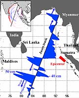 Pasadena CA (JPL) Jan 12, 2005 For the first time, orbiting satellites have observed and measured a major tsunami event in open ocean, the Indian Ocean tsunami that resulted from the magnitude 9 earthquake southwest of Sumatra on December 26. The measurements are of tremendous value to researchers worldwide and will aid our understanding of these events. U.S. and French teams working in parallel with altimetry data from the joint NASA/French Space Agency Jason and Topex/Poseidon oceanography satellites have independently confirmed the satellites' measurements of the height of the tsunami waves as they radiated from the earthquake's epicenter. The satellites flew over the Bay of Bengal about 150 kilometers (93 miles) apart approximately two hours after the quake. "These two satellites make only about 13 Earth revolutions daily, with each orbit passing over the Earth approximately 3,000 kilometers (1,864 miles) away from its last," said Dr. Philip Callahan of NASA's Jet Propulsion Laboratory, Pasadena, Calif. Callahan has been searching for tsunami signals in satellite radar altimeter data since Topex/Poseidon's launch in 1992. "There is a very low probability of capturing observations in any given location within two hours of an event like this. The fact that Jason captured the tsunami's signals is serendipitous, but is nevertheless a major boon for oceanographers," he said. "The observations made by Jason and Topex/Poseidon are unique and of tremendous value for testing and improving tsunami computer models and developing future tsunami early warning systems," said JPL's Dr. Lee-Lueng Fu, Jason and Topex/Poseidon project scientist. "The satellite altimeter data currently take a minimum of five hours to process, so they cannot provide early warning of such events," said Fu. Dr. Callahan received the Jason data the morning of December 27. The new images are available online at: http://photojournal.jpl.nasa.gov/catalog/PIA07219 The main figure displays changes in sea surface height from previous observations made along the same ground track 20 to 30 days before the earthquake, showing the signals of the tsunami waves. The inset is a computer model of simulated changes in sea surface height created by Kenji Satake of the National Institute of Advanced Industrial Science and Technology, Japan. It provides a basin-wide perspective for interpreting the Jason and Topex/Poseidon satellite observations, which are in good agreement with the model. The satellites recorded a maximum sea surface elevation gain (deviation from normal) of 50 centimeters (1.6 feet) on the open ocean about 1,200 kilometers (746 miles) south of Sri Lanka at the leading crest of a tsunami wave raging out of the Bay of Bengal. It was followed by a trough of sea surface depression of 40 centimeters (1.3 feet) below normal. The distance from one wave crest to the next was about 800 kilometers (500 miles). The first wave was followed by a second with a crest height of 40 centimeters (1.3 feet) above normal. Near the northern end of the Bay, two waves with crest heights of 40 centimeters (1.3 feet) and 20 centimeters (0.66 feet) above normal were approaching the coasts of Myanmar. Spreading across the Bay of Bengal from the earthquake zone offshore from Western Sumatra, these tsunami waves eventually reached shallow waters along the coasts of Sumatra, Sri Lanka, Thailand and Southern India. Their open ocean speeds reduced from that of a jet plane, 800 kilometers (500 miles) per hour, to about 32 kilometers (20 miles) per hour, building the open ocean wave heights of 0.5 meters (1.6 feet) or less to walls of water up to 10 meters (33 feet) high with great destructive power. Jason and Topex/Poseidon are collaborative satellite missions of NASA and the French Space Agency, Centre National d'Estudes Spatiales. The primary objectives of the two missions are to make long-term measurements of the height of the world's sea surface to better understand ocean circulation and its effects on climate. "The information on sea surface height from these satellites has many other applications, and can be used to aid navigation, offshore operations, hurricane forecasting, fisheries, etcetera," said Dr. Yves Menard, Jason and Topex/Poseidon project scientist at the Centre National d'Estudes Spatiales. "The detection of these tsunami waves provides yet another demonstration of the important value of satellite radar altimeter observations." NASA and the French Space Agency are working with the National Oceanic and Atmospheric Administration and the European Organization for the Exploitation of Meteorological Satellites to develop the next radar altimeter mission, the Ocean Surface Topography Mission, targeted for launch in 2008. It will make radar altimeter measurement a routine operation of those organizations in the future. Community Email This Article Comment On This Article Related Links Latest Jason-1 data AVISO SpaceDaily Search SpaceDaily Subscribe To SpaceDaily Express Tectonic Science and News