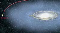 Green Bank - May 26, 2003 New observations with National Science Foundation's Robert C. Byrd Green Bank Telescope (GBT) suggest that what was once believed to be an intergalactic cloud of unknown distance and significance, is actually a previously unrecognized satellite galaxy of the Milky Way orbiting backward around the Galactic center. Jay Lockman of the National Radio Astronomy Observatory (NRAO) in Green Bank, West Virginia, discovered that this object, known as "Complex H," is crashing through the outermost parts of the Milky Way from an inclined, retrograde orbit. Lockman's findings will be published in the July 1 issue of the Astrophysical Journal Letters. "Many astronomers assumed that Complex H was probably a distant neighbor of the Milky Way with some unusual velocity that defied explanation," said Lockman. "Since its motion appeared completely unrelated to Galactic rotation, astronomers simply lumped it in with other high velocity clouds that had strange and unpredictable trajectories." High velocity clouds are essentially what their name implies, fast-moving clouds of predominately neutral atomic hydrogen. They are often found at great distances from the disk of the Milky Way, and may be left over material from the formation of our Galaxy and other galaxies in our Local Group. Over time, these objects can become incorporated into larger galaxies, just as small asteroids left over from the formation of the solar system sometimes collide with the Earth. Earlier studies of Complex H were hindered because the cloud currently is passing almost exactly behind the outer disk of the Galaxy. The intervening dust and gas that reside within the sweeping spiral arms of the Milky Way block any visible light from this object from reaching the Earth. Radio waves, however, which have a much longer wavelength than visible light, are able to pass through the intervening dust and gas. The extreme sensitivity of the recently commissioned GBT allowed Lockman to clearly map the structure of Complex H, revealing a dense core moving on an orbit at a 45-degree angle to the plane of the Milky Way. Additionally, the scientist detected a more diffuse region surrounding the central core. This comparatively rarefied region looks like a tail that is trailing behind the central mass, and is being decelerated by its interaction with the Milky Way. "The GBT was able to show that this object had a diffuse 'tail' trailing behind, with properties quite different from its main body," said Lockman. "The new data are consistent with a model in which this object is a satellite of the Milky Way in an inclined, retrograde orbit, whose outermost layers are currently being stripped away in its encounter with the Galaxy." These results place Complex H in a small club of Galactic satellites whose orbits do not follow the rotation of the rest of the Milky Way. Among the most prominent of these objects are the Magellanic Clouds, which also are being affected by their interaction with the Milky Way, and are shedding their gas in a long stream. Since large galaxies, like the Milky Way, form by devouring smaller galaxies, clusters of stars, and massive clouds of hydrogen, it is not unusual for objects to be pulled into orbit around the Galaxy from directions other than that of Galactic rotation. "Astronomers have seen evidence that this accreting material can come in from wild orbits," said Butler Burton, an astronomer with the NRAO in Charlottesville, Virginia. "The Magellanic clouds are being torn apart from their interaction with the Milky Way, and there are globular clusters rotating the wrong way. There is evidence that stuff was going every-which-way at the beginning of the Galaxy, and Complex H is probably left over from that chaotic period." The new observations place Complex H at approximately 108,000 light-years from the Galactic center, and indicate that it is nearly 33,000 light-years across, containing approximately 6 million solar masses of hydrogen. Radio telescopes, like the GBT, are able to observe these cold, dark clouds of hydrogen because of the natural electromagnetic radiation emitted by neutral atomic hydrogen at radio wavelengths (21 centimeters). Globular clusters, and certain other objects in the extended Galactic halo, can be studied with optical telescopes because the material in them has collapsed to form hot, bright stars. The GBT is the world's largest fully steerable radio telescope. It was commissioned in August of 2000, and continues to be outfitted with the sensitive receivers and components that will allow it to make observations at much higher frequencies. The National Radio Astronomy Observatory is a facility of the National Science Foundation, operated under a cooperative agreement with Associated Universities, Inc. Community Email This Article Comment On This Article Related Links National Radio Astronomy Observatory SpaceDaily Search SpaceDaily Subscribe To SpaceDaily Express Stellar Chemistry, The Universe And All Within It