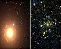 Pasadena CA (SPX) Nov 03, 2008 NASA's Galaxy Evolution Explorer has lifted the veil off a ghost known to haunt the local universe, providing new insight into the formation and evolution of galaxies. The eerie creature, called NGC 404, is a type of galaxy known as "lenticular." Lenticular galaxies are disk-shaped, with little ongoing star formation and no spiral arms. NGC 404 is the nearest example of a lenticular galaxy, and therefore of great interest. But it lies hidden in the glare from a red giant star called Mirach. For this reason, NGC 404 became known to astronomers as the "Ghost of Mirach." When the Galaxy Evolution Explorer spied the galaxy in ultraviolet light, a spooky ring materialized. "We thought this celestial ghost was essentially dead, but we've been able to show that it has an extended ring of new stars. The galaxy has a hybrid character in which the well-known, very old stellar population tells only part of the story," said David Thilker of Johns Hopkins University in Baltimore. "It's like the living dead." Thilker and members of the Galaxy Evolution Explorer team spotted the Ghost of Mirach in images taken during the space telescope's all-sky survey. The Galaxy Evolution Explorer is a relatively low-cost NASA mission, launched in 2003, with an ambitious charge to survey the entire visible sky in ultraviolet light, a job never before accomplished. Because Earth's atmosphere absorbs ultraviolet photons -- a good thing for us living creatures who are susceptible to the damaging light -- ultraviolet telescopes must operate from space. The first images of the Ghost of Mirach taken by the Galaxy Evolution Explorer hinted at a surrounding ultraviolet-bright extended structure. Subsequent, longer exposure observations indeed show that the lenticular galaxy is surrounded by a clumpy, never-before-seen ring of stars. What is this mysterious ultraviolet ring doing around an otherwise nondescript lenticular galaxy? As it turns out, previous imaging with the National Science Foundation's Very Large Array radio telescope in New Mexico had discovered a gaseous ring of hydrogen that matches the ultraviolet ring observed by the Galaxy Evolution Explorer. The authors of this Very Large Array study attributed the gas ring to a violent collision between NGC 404 and a small neighboring galaxy 900 million years ago. The ultraviolet observations demonstrate that, when the hydrogen from the collision settled into the plane of the lenticular galaxy, stars began to form in a ghostly ring. Young, relatively hot stars forming in stellar clusters sprinkled throughout NGC 404's ring give off the ultraviolet light that the Galaxy Evolution Explorer was able to see. "Before the Galaxy Evolution Explorer image, NGC 404 was thought to contain only very old and evolved red stars distributed in a smooth elliptical shape, suggesting a galaxy well into its old age and no longer evolving significantly," said Mark Seibert of the Observatories of the Carnegie Institution of Washington in Pasadena, Calif. "Now we see it has come back to life, to grow once again." "The Ghost of Mirach has been lucky enough to get a new lease on life through the rejuvenating, chance merger with its dwarf companion," added Thilker. The findings indicate that the evolution of lenticular galaxies might not yet be complete. They may, in fact, continue to form stars in a slow, piecemeal fashion as they suck the raw, gaseous material for stars from small, neighboring galaxies. It seems the Ghost of Mirach might act more like a vampire than a ghost. Caltech leads the Galaxy Evolution Explorer mission and is responsible for science operations and data analysis. NASA's Jet Propulsion Laboratory in Pasadena, Calif., manages the mission and built the science instrument. The mission was developed under NASA's Explorers Program managed by the Goddard Space Flight Center, Greenbelt, Md. Researchers sponsored by Yonsei University in South Korea and the Centre National d'Etudes Spatiales (CNES) in France collaborated on this mission. Community Email This Article Comment On This Article Share This Article With Planet Earth