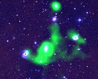 Calgary, Alberta (SPX) Jun 7, 2006 Astronomers have detected substantial amounts of filamentary cold gas in compact groups of galaxies, highlighting what may be an important force in galactic evolution. The findings also raise the possibility that more matter than previously thought might be tied up in these galaxy groups, captured in the lattice of the cosmic web. The research was presented at the 208th meeting of the American Astronomical Association by Sanchayeeta Borthakur of the University of Massachusetts at Amherst. Lourdes Verdes-Montenegro, of Instituto de Astrofisica de Andalucia in Spain, also collaborated. Most spiral galaxies, such as the Milky Way, are brimming with cold gas that fuels the creation of stars. These relatively young galaxies shine with bluish light and are scattered throughout the universe, often in little groups. Elliptical galaxies, on the other hand, tend to shine red and live a crammed existence with thousands like them in giant galactic clusters. These enormous, older galaxies no longer make stars, because they have been stripped of their gas, which gets swirled into the cluster's center, collecting in a massive hot soup astronomers call the intracluster medium. Recently astronomers have noticed that some groups of spiral galaxies don't contain as much hydrogen gas as expected and are no longer birthing new stars, qualities usually found in older galaxies living out their years within a cluster. "The spiral galaxies in the groups we looked at look old and tired. It's as if they've prematurely aged," Yun said. Astronomers are still trying to figure out what happens between being a young, blue galaxy and an old, red one, Yun said. Perhaps group living was taking a toll on these young galaxies and, like the intracluster medium, the gravitational forces of an intragroup medium were stripping them of their star fuel. Presence of intragroup gas had been confirmed by recent observations using X-rays, but the amount of gas detected by the X-rays couldn't account for the amount missing from the galaxies. So, Yun's team began observing 25 Hickson Compact Groups - compact, relatively isolated, groups of galaxies, some of which had shown this mysterious gas depletion. The scientists used the National Science Foundation's Robert C. Byrd Green Bank Telescope in West Virginia, operated by the National Radio Astronomy Observatory. The Green Bank Telescope uses radio waves and has a 100 meter aperture lens. It can point into the sky more precisely than one thousandth of a degree and is the most sensitive tool astronomers have for detecting neutral hydrogen gas in galaxies, gas not visible with X-ray observations. The researchers detected far more gas than they would have imagined, Yun said. In groups dominated by spiral galaxies, the astronomers found about 50 percent more gas than they had detected using the NSF's Very Large Array in New Mexico - also operated by the NRAO. Groups containing elliptical or lenticular galaxies had almost 100 percent more gas than had been previously detected. Just as surprising as the quantity of gas is its temperature, Yun said. The gas is cold and neutral, not the fiery hot gas of the intracluster medium. Intracluster mediums have enormous amounts of mass, both from ordinary matter and from dark matter, and hence have extremely strong gravitational fields. This can lead to excessively high temperatures - upwards of a million degrees - so astronomers hadn't looked much for cold, neutral gas. "It makes sense actually," Yun said, the groups aren't as massive as clusters, so the gas isn't as hot. Borthakur's calculations suggest this gas can remain cold and neutral for as much as 100 million years or more in the group environment. The findings suggest this environment plays a far more important role in the evolution of galaxies than astronomers previously thought. "The local environment clearly can influence a galaxy's gas content and its ability to form stars," Yun said. Since these qualities are one measure of a galaxy's age, the findings may prompt a re-evaluation of the cosmic clock, he added. Another intriguing aspect of this cold neutral hydrogen gas is its distribution, says Borthakur. Analyses suggest the gas forms sheet-like or filamentary structures, rather than a single diffuse cloud that surrounds the entire group. This raises the possibility the intragroup medium builds up through the accumulation of matter from the cosmic web, the large scale structure astronomers think could link all of the matter in the universe, as predicted by the theory of dark matter. "The only way a galaxy could be cleanly stripped of its gas is through a collision with more gas," Yun said. Gas accounts for far more of a galaxy's mass than its stars do, such that if an outer galaxy falls into a cluster its gas is stripped, subsumed by the intracluster medium. "A lot of the matter of the universe may be tied up in these small galaxy groups," he said. Future experiments designed to determine the temperature, density and the total mass of this intragroup medium will be able to determine quantitatively its origin and the importance of this gas in shaping the evolution of most galaxies. Community Email This Article Comment On This Article Related Links VLA DSS2 NRAO Stellar Chemistry, The Universe And All Within It