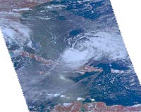 Greenbelt MD (SPX) Sep 02, 2008 Tropical Storm Hanna has virtually parked herself north of the Caicos Islands in the Atlantic Ocean, continuing to bring residents heavy rains and winds. A tropical storm warning remains in effect for the central and southeastern Bahamas and the Turks and Caicos islands. This visible image of Hanna was created by data from the Atmospheric Infrared Sounder (AIRS), an instrument that flies aboard NASA's Aqua satellite. It was created on August 31 at 18:11 UTC (2:11 p.m. EDT). At 8:00 a.m. EDT the center of Tropical Storm Hanna had maximum sustained winds near 50 mph. She was located near latitude 23.6 north and longitude 72.4 west or about 90 miles north-northeast of the southeastern Bahamas. She's been nearly stationary, drifting westward near 2 mph and will continue that way for the next day or two. On the forecast track the center of Hanna will move near or over the southeastern Bahamas during the next day or two. The estimated minimum central pressure is 996 millibars. Rainfall expected through Thursday over the central and Southeastern Bahamas and the Turks and Caicos islands will be between 4 to 8 inches with maximum amounts near 12 inches. In addition, ocean swells are expected to increase the risk of dangerous rip currents along portions of the southeastern United States coast during the next couple of days. Community Email This Article Comment On This Article Share This Article With Planet Earth