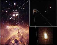 Baltimore MDs (SPX) Dec 14, 2006 The small open star cluster Pismis 24 lies in the core of the large emission nebula NGC 6357 in Sagittarius, about 8,000 light-years away from Earth. Some of the stars in this cluster are extremely massive and emit intense ultraviolet radiation. The brightest object in the picture is designated Pismis 24-1. It was once thought to weigh as much as 200 to 300 solar masses. This would not only have made it by far the most massive known star in the galaxy, but would have put it considerably above the currently believed upper mass limit of about 150 solar masses for individual stars. However, high-resolution Hubble Space Telescope images of the star show that it is really two stars orbiting one another (inset pictures at top right and bottom right). They are estimated to each be 100 solar masses. The Hubble Advanced Camera for Surveys images were taken in April 2006. Community Email This Article Comment On This Article Related Links Stellar Chemistry, The Universe And All Within It Stellar Chemistry, The Universe And All Within It