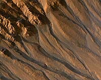 Phoenix AZ (SPX) Jan 24, 2008 Mars has an ethereal, tenuous atmosphere at less than 1 percent the surface pressure of Earth, so scientists working on The University of Arizona's High Resolution Imaging Experiment, or HiRISE, are challenged to explain the complex, wind-sculpted landforms they're now seeing in unprecedented detail. The HiRISE camera on NASA's Mars Reconnaissance Orbiter, the most powerful camera to orbit another planet, can see 20-inch-diameter features while flying at about 7,500 mph between 155 and 196 miles above the Martian surface. HiRISE is giving researchers eye-opening new views of wind-driven Mars geology. One of the main questions has been if winds on present-day Mars are strong enough to form and change geological features, or if wind-constructed formations were made in the past, perhaps when winds speeds and atmospheric pressures were higher, HiRISE team members say. "We're seeing what look like smaller sand bedforms on the tops of larger dunes, and, when we zoom in more, a third set of bedforms topping those," HiRISE co-investigator Nathan Bridges of the Jet Propulsion Laboratory in Pasadena, Calif., said. "On Earth, small bedforms can form and change on time scales as short as a day." There are two kinds of "bedforms," or wind-deposited landforms. They can be sand dunes, which are typically larger and have distinct shapes. Or they can be ripples, which is sand mixed with coarser, millimeter-sized particles. Ripples are typically smaller, more linear structures. HiRISE also shows detail in sediments deposited by winds on the lee side of rocks. Such rock "windtails" show which way the most current winds have blown, Bridges said. Such features have been seen before, but only by rovers and landers, never an orbiting camera. Researchers can now use HiRISE images to infer wind directions over the entire planet. Scientists discovered miles-long, wind-scoured ridges called "yardangs" with the first Mars orbiter, Mariner 9, in the early 1970s, Bridges said. New HiRISE images reveal surface texture and fine-scale features that are giving scientists insight on how yardangs form. "HiRISE is showing us just how interesting layers in yardangs are," Bridges said. "For example, we see one layer that appears to have rocks in it. You can actually see rocks in the layer, and if you look downslope, you can see rocks that we think have eroded out from that rocky layer above." HiRISE shows that some layers in the yardangs are made of softer materials that have been modified by wind, he added. The soft material could be volcanic ash deposits, or the dried up remnants of what once were mixtures of ice and dust, or something else. "The fact that we see layers that appear to be rocky and layers that are obviously soft says that the process that formed yardangs is no simple process but a complicated sequence of processes," Bridges said. Scientists since the 1970s Viking missions have puzzled over what appears to be dust covering Mars' 6-to-13-mile-high volcanoes. Near the volcanic summits, the air is about one one-thousandth of Earth's atmospheric pressure. "HiRISE keeps showing interesting things about terrains that I expected to be uninteresting," said HiRISE principal investigator Alfred McEwen of the UA's Lunar and Planetary Laboratory. "I was surprised by the diversity of morphology of the thick dust mantles. Instead of a uniform blanket of smooth dust, there are often intricate patterns due to the action of the wind and perhaps light cementation from atmospheric volatiles." HiRISE images show that what covers the slopes of the high Martian volcanoes are definitely dunes or ripples that appear to have an organized 'reticulate' structure possibly formed by winds blowing from multiple directions, Bridges said. "On Earth, winds blowing from many different directions form what are called 'star dunes,' and these look somewhat like those," Bridges said. "The reticulate surface looks like a network of connected wind-blown dunes and ripples. "The fact that the air pressure near the volcano tops is so low and the material is dust challenges us to understand what these features are," he said. "Perhaps the dust is clumping together and making sand-size material. But how this stuff can be blown around this low pressure is at the edge of our understanding of aeolian physics. "Possibly the bedforms on the volcanoes formed under a different Martian climate in the past, when atmospheric density was greater," Bridges said. "But I'm not sure that's the case, because you can see evidence that a lot of the mantle appears to be fairly recent." HiRISE team member Paul Geissler of the U.S. Geological Survey, in Flagstaff, Ariz., has discovered from HiRISE images that dark streaks coming from Victoria Crater are probably streaks of dark sand blown out from the crater onto the surface. Scientists had wondered if wind might have blown away lighter-colored surface material, exposing a darker underlying surface. Geissler, a member of the Mars Exploration Rover team, is comparing HiRISE images with images the Opportunity rover has taken at Victoria Crater. Bridges is lead author on the paper titled "Windy Mars: A dynamic planet as seen by the HiRISE camera" in the Geophysical Research letters in December. McEwen is among the paper's co-authors. Community Email This Article Comment On This Article Related Links Mars Reconnaissance Orbiter Mars News and Information at MarsDaily.com Lunar Dreams and more