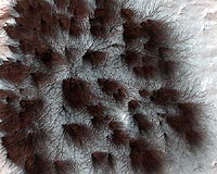 Tempe AZ (SPX) Mar 27, 2009 The High Resolution Imaging Experiment, or HiRISE, run from The University of Arizona, is seeing signs of spring on Mars. The signs are absolutely martian and unearthly. The HiRISE team has released new high-resolution images of terrain at Mars' south polar region taken last month by their camera aboard NASA's Mars Reconnaissance Orbiter. "Spring on Mars is quite different from spring on Earth because Mars has not just permanent ice caps, but also seasonal polar caps of carbon dioxide, familiar to us on Earth as dry ice," said HiRISE deputy principal investigator Candice J. Hansen-Koharcheck of the NASA Jet Propulsion Laboratory in Pasadena, Calif. The seasonal polar caps form each winter because carbon dioxide in the atmosphere changes directly to frost, which builds into a dry ice layer over Mars' surface. Dry ice caps can be as much as a meter thick, Hansen-Koharcheck said. Then, as winter wanes and spring arrives, warmer temperatures thaw solid carbon dioxide directly from ice into gas. The seasonal ice cap thins both from the top and the bottom. The gas beneath the ice cap can flow in the same places year after year after year, eroding troughs in the surface of the planet. Scientists know that the gas carves troughs into the surface of the planet itself because the troughs are still visible after the caps are gone entirely. "What happens on Mars, we think, is that as the seasonal ice cap thins from the bottom, gas underneath the cap builds up pressure," Hansen-Koharcheck said. "And where gas under the ice finds a weak spot or a crack, it will flow out of the opening, often carrying a little dust from the surface below." That pressure buildup beneath the carbon-dioxide ice is a key difference between this process and springtime thawings of frozen water on Earth. When warmed, water ice and snowpacks on Earth can melt to liquid and either run off beneath the frozen layer or soak into the ground. One HiRISE image released shows fan-shaped deposits of dust that form beautiful starburst patterns. The dust was carried from beneath the seasonal ice cap by jets of carbon dioxide escaping from radial troughs, often called "spiders," because of their shape. Another HiRISE image released shows how dust that has been carried to the surface by gas jetting through the ice cap is blown about by prevailing winds before settling in fan-shaped deposits atop the ice cap. Many jets appear to be active at the same time, according to this picture, because numerous fans are all deposited in the same direction. Fans at the top of the picture are oriented in one direction, while fans at the bottom are oriented in a different direction. This suggests that as the ice layer thins, a set of gas jets becomes active and dies down, then another set, farther away, becomes active at a later time when there is a different prevailing wind direction, Hansen-Koharcheck said. She estimated that the ice cap seen in the images is about a half-meter thick. Mars Reconnaissance Orbiter is managed by NASA's Jet Propulsion Laboratory, a division of the California Institute of Technology, for the NASA Science Mission Directorate. Lockheed Martin Space Systems, based in Denver, is the prime contractor and built the spacecraft. Ball Aerospace and Technologies Corp., of Boulder, Colo., built the HiRISE camera. Share This Article With Planet Earth
