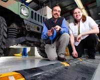 West Lafayette IN (SPX) Apr 14, 2009 Researchers have developed a technology that detects damage to critical suspension components in military vehicles simply by driving over a speed bumplike "diagnostic cleat" containing sensors. "Our aim is to save time and maintenance costs, but more importantly to reduce downtime by catching damage before it leads to failure in the field," said Douglas Adams, an associate professor of mechanical engineering and director of Purdue University's Center for Systems Integrity. Purdue is working with the U.S. Army and Honeywell International Inc. to develop the technology. The vehicles are driven over the "tactical wheeled vehicle diagnostic cleat," which is like a rubber-jacketed speed bump equipped with sensors called triaxial accelerometers. The system measures vibrations created by forces that a vehicle's tires apply to the cleat. Damage is detected in the tires, wheel bearings and suspension components by using signal processing software to interpret the sensor data. "Let's say one of the tires is severely under pressure," Adams said. "The cleat tells you to turn around and fill up that tire because you are about to embark on a 10-hour mission with this vehicle. Or, you are returning the vehicle to the depot and the cleat tells you that the right rear suspension has a problem in the shock absorber or a critical bolt in the front suspension is broken. The maintenance personnel don't have to troubleshoot the vehicle. They know what to fix." The system also could be used in commercial applications to test civilian vehicles, he said. Research findings are detailed in a technical paper being presented April 22 during the Society of Automotive Engineers World Congress in Detroit. The researchers have filed for a patent on the technique, which has been nominated as a U.S. Army invention of the year by the Army's Tank Automotive Research, Development and Engineering Center, in Warren, Mich. "The diagnostic cleat is designed to be quick and easy to use," said Joseph Gothamy, acting team leader for the reliability and durability modeling and simulation team at the U.S. Army center. "The last thing we want to do is take time from already overburdened soldiers and maintenance officers. The cleat is a quick first check to determine what's mechanically wrong with a vehicle before wasting time hunting for potentially simple problems." The technical paper was written by Purdue mechanical engineering graduate student Tiffany DiPetta, Purdue senior research engineer David Koester, Adams, and four researchers from the U.S. Army: Gothamy, Paul Decker, David Lamb and David Gorsich, from the Tank Automotive Research, Development and Engineering Center. "Operating and maintenance costs for military weapon systems accounted for about 60 percent of the $500 billion U.S. Department of Defense budget in 2006," Adams said. "Better diagnostic and prognostic technologies could reduce this expense and ensure readiness of ground vehicle fleets." By using the instrumented cleat and other "condition-based" maintenance methods, the military could reduce costs by performing work on vehicles when needed based on the condition of parts instead of performing scheduled maintenance on vehicles regardless of whether they need the work. "In theatre, some vehicles may be used at checkpoints while others may be hauling supplies hundreds of miles," Gothamy said. "Even if the same vehicle variant is used, they are on very different missions and trying to use the same regular maintenance schedule for both isn't always efficient or effective." The researchers tested their system in experiments with high-mobility multipurpose wheeled vehicles, or Humvees, and also developed a computational model to simulate how the system works. "Our simulated model showed us that we were capable of using the system accurately to detect damage to vehicle components, and our experiments with actual vehicles validated the model," said Adams, whose research also uses facilities at Purdue's Ray W. Herrick Laboratories. "The system was sensitive to as little as a 5 percent change in the stiffness of the suspension." Findings show the method is capable of accurately identifying damage to vehicle tires and the suspension. A damaged coil spring in the front suspension of a Humvee was detected even when tire pressure was varied widely in attempt to confuse the system. "This system is currently ready to acquire more data in Army depots, and we are working with the Tank Automotive Research, Development and Engineering Center to start a large vehicle survey exercise with vehicles coming back from overseas," Adams said. "Data will be used to determine the types of wear and tear exhibited by vehicles deployed in certain terrains." The system does not require specialized training to operate, and it is relatively inexpensive, costing about $1,500, which is spread across the inventory of about 20,000 vehicles, Adams said. Share This Article With Planet Earth