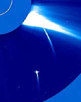 Paris (ESA) Jul 07, 2005 As of 6 July 2005, 989 comets have been discovered using the ESA/NASA Solar and Heliospheric Observatory (SOHO) spacecraft, which is expected to discover its 1000th comet this summer. The SOHO spacecraft, a joint effort between NASA and the European Space Agency, has been so prolific that it has accounted for almost half of all comet discoveries for which orbits have been computed in the history of astronomy. Before SOHO was launched, only 16 'sungrazing' comets had been discovered by space observatories. Based on that experience, who could have predicted that SOHO would discover more than sixty times that number, and in only nine years? Comets are chunks of ice and dust that zoom around the Solar System in elongated orbits. These 'dirty snowballs' are the nucleii of the comets. Comet nuclei are thought to be cosmic 'leftovers', the condensed remains of the gas and dust cloud that formed the Solar System. About 85 percent of the comets discovered so far by SOHO belong to the Kreutz group of 'sungrazing' comets, so named because their orbits take them very close to the Sun. The Kreutz sungrazers come within 800 000 km of the Sun's visible surface. In comparison, Mercury, the planet closest to the Sun, is about 57.6 million km from the solar surface. SOHO has also been used to discover three other well-populated comet groups: the Meyer (at least 55 members), Marsden (at least 21 members), and Kracht (24 members) groups. Comet groups are named after the astronomer who determined that they are related because they have similar orbits. Many SOHO comet discoveries have been by amateurs using SOHO images on the internet. SOHO comet hunters come from all over the world; the United States, United Kingdom, China, Japan, Taiwan, Russia, Ukraine, France, Germany and Lithuania are among the many countries whose citizens have used SOHO to chase comets. Almost all SOHO's comets are discovered using images from its Large Angle and Spectrometric Coronagraph (LASCO) instrument. LASCO is used to observe the faint, multimillion-degree outer atmosphere of the Sun, called the corona. A disk in the instrument is used to make an artificial eclipse, blocking direct light from the Sun so the much fainter corona can be seen. Sungrazing comets are discovered when they enter LASCO's field of view as they pass close by the Sun. SOHO successfully completed its primary mission in April 1998, and it has enough fuel to remain on station and keep hunting comets for decades, assuming the LASCO instrument continues to function. Community Email This Article Comment On This Article Related Links Enter SOHO 1000th comet contest SpaceDaily Search SpaceDaily Subscribe To SpaceDaily Express Asteroid and Comet Mission News, Science and Technology
