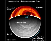 Paris, France (ESA) Sep 19, 2008 It is well known that winds on Venus are extremely fast and powerful. Now, ESA's Venus Express has, for the first time, put together a 3-D picture of the venusian winds for an entire planetary hemisphere. The most powerful atmospheric investigator ever sent to Venus, Venus Express has an advantageous orbit around the planet and a unique set of instruments. The spacecraft has the ability to peer through Venus's thick atmospheric layers and obtain a truly global picture. The spacecraft has continuously monitored the planet since observations began in 2006, and scientists now have enough data to start building a complete picture of the planet's atmospheric phenomena. The Venus Express Visual and Infrared Thermal Imaging Spectrometer, VIRTIS, has been studying the thick blanket of clouds that surround Venus, gathering data on the winds. The area studied spans altitudes of 45 to 70 km above the surface and covers the entire southern hemisphere, up to the equator. It is above the southern hemisphere that Venus Express reaches its highest point in orbit (about 66 000 km), allowing the instruments to obtain a global view. Agustin S�nchez-Lavega, from the Universidad del Pa�s Vasco in Bilbao, Spain, led the research on 3-D wind mapping with data from the first year of VIRTIS observations. "We focused on the clouds and their movement. Tracking them for long periods of time gives us a precise idea of the speed of the winds that make the clouds move and of the variation in the winds," he said. Tracking the clouds at different altitudes is possible only if the instrument is able to look through the curtain of clouds. "VIRTIS operates at different wavelengths, each of which penetrates the cloud layer to a different altitude," added Ricardo Hueso, also from the Universidad del Pa�s Vasco, co-author of the results. "We studied three atmospheric layers and followed the movement of hundreds of clouds in each. This has never been done before at such large temporal and spatial scales, and with multi-wavelength coverage." In total, the team tracked 625 clouds at about 66 km altitude, 662 at around 61 km altitude, and 932 at about 45-47 km altitude, on the day and night sides of the planet. The individual cloud layers were imaged over several months for about 1-2 hours each time. "We have learnt that between the equator and 50-55 degrees latitude south, the speed of the winds varies a lot, from about 370 km/h at a height of 66 km down to about 210 km/h at 45-47 km", said S�nchez-Lavega. "At latitudes higher than 65 degrees, the situation changes dramatically - the huge hurricane-like vortex structure present over the poles takes over. All cloud levels are pushed on average by winds of the same speed, independently of the height, and their speed drops to almost zero at the centre of the vortex." S�nchez-Lavega and colleagues observed that the speed of the zonal winds (which blow parallel to the lines of latitude) strongly depend on the local time. The difference in the Sun's heat reaching Venus in the mornings and in the evenings - called the solar tide effect - influences the atmospheric dynamics greatly, making winds blow more strongly in the evenings. On average, the winds regain their original speeds every five days, but the mechanism that produces this periodicity needs further investigation. "VIRTIS is continuing its observations, and over the next few years we expect to understand more precisely how stable or variable the venusian winds at the upper and lower cloud layers are," concluded Giuseppe Piccioni, from the Istituto Nazionale di Astrofisica in Rome, Italy, co-Principal Investigator for the VIRTIS instrument. Community Email This Article Comment On This Article Share This Article With Planet Earth