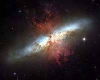 Baltimore MD (SPX) Apr 25, 2006 To celebrate the Hubble Space Telescope's 16 years in orbit, NASA and ESA have released this image of the starburst galaxy Messier 82. The mosaic image represents the sharpest wide-angle view ever obtained of M82. The galaxy is remarkable for its bright blue disk, webs of shredded clouds, and fiery-looking plumes of glowing hydrogen blasting out of its central regions. Throughout the galaxy's center, young stars are being born 10 times faster than they are in the Milky Way. The resulting huge concentration of young stars carved into the gas and dust at the galaxy's center. The fierce galactic superwind generated from these stars compresses enough gas to make millions of more stars. In M82, young stars are crammed into tiny but massive star clusters. These, in turn, congregate by the dozens to make the bright patches, or starburst clumps, as astronomers call them, in the central parts of M82. The clusters in the clumps can only be distinguished in the sharp Hubble images. Most of the pale, white objects sprinkled around the body of M82 that look like fuzzy stars are actually individual star clusters about 20 light-years across and contain up to a million stars. Astronomers think the rapid rate of star formation in this galaxy eventually will be self-limiting. When star formation becomes too vigorous, it will consume or destroy the material needed to make more stars. The starburst then will subside, probably in a few tens of millions of years. Located 12 million light-years away, M82 appears high in the northern spring sky in the direction of the constellation Ursa Major, the Great Bear. It is also called the Cigar Galaxy, because of the elliptical shape produced by the oblique tilt of its starry disk relative to its line of sight. Hubble completed the observation last month with its Advanced Camera for Surveys' Wide Field Channel, and astronomers assembled the six-image mosaic by combining exposures taken with four colored filters that capture starlight from visible and infrared wavelengths, as well as the light from the glowing hydrogen filaments. Hubble was launched on April 24, 1990, aboard space shuttle Discovery. Community Email This Article Comment On This Article Related Links Hubble Space Telescope Science Institute The Art of Space - Desktops and Eyecandy