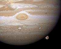 Tempe AZ (SPX) Dec 19, 2008 NASA's Hubble Space Telescope has caught Jupiter's moon Ganymede playing a game of "peek-a-boo." In this crisp Hubble image, Ganymede is shown just before it ducks behind the giant planet. Ganymede completes an orbit around Jupiter every seven days. Because Ganymede's orbit is tilted nearly edge-on to Earth, it routinely can be seen passing in front of and disappearing behind its giant host, only to reemerge later. Composed of rock and ice, Ganymede is the largest moon in our solar system. It is even larger than the planet Mercury. But Ganymede looks like a dirty snowball next to Jupiter, the largest planet in our solar system. Jupiter is so big that only part of its Southern Hemisphere can be seen in this image. Hubble's view is so sharp that astronomers can see features on Ganymede's surface, most notably the white impact crater, Tros, and its system of rays, bright streaks of material blasted from the crater. Tros and its ray system are roughly the width of Arizona. The image also shows Jupiter's Great Red Spot, the large eye-shaped feature at upper left. A storm the size of two Earths, the Great Red Spot has been raging for more than 300 years. Hubble's sharp view of the gas giant planet also reveals the texture of the clouds in the Jovian atmosphere as well as various other storms and vortices. Astronomers use these images to study Jupiter's upper atmosphere. As Ganymede passes behind the giant planet, it reflects sunlight, which then passes through Jupiter's atmosphere. Imprinted on that light is information about the gas giant's atmosphere, which yields clues about the properties of Jupiter's high-altitude haze above the cloud tops. This color image was made from three images taken on April 9, 2007, with the Wide Field Planetary Camera 2 in red, green, and blue filters. The image shows Jupiter and Ganymede in close to natural colors. Share This Article With Planet Earth