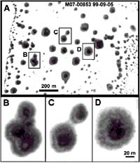 by Timothy N. Titus, Ph.D U.S.G.S. Astrogeology Team Speculations about life on Mars have always caused great interest and controversy. Recently, several Internet articles have been posted describing the discovery of Martian Surface Organisms in the south polar region of Mars. As a research scientist working on the Mars Global Surveyor (MGS) Thermal Emission Spectrometer (TES) Team, I have spent the last four years analyzing data from this Martian region. The data reveal a region active with interesting and intriguing physical phenomena, but does not suggest the existence of life. Hungarian scientists have reported evidence of life in the Martian southern polar region. They claim that the dark spots observed during the southern spring are living organisms, similar to those found at the south pole of Earth. This comparison of the Martian southern polar cap to the Earth's Antarctica is highly inaccurate and misleading since the two regions have little in common. Antarctica has an abundant supply of water ice at a mean winter surface temperature of between -40�F (-40�C) and -94�F (-70�C). The Martian seasonal cap is almost entirely dry ice at a surface temperature of -195�F (-126�C). The near absence of water, even in the form of ice, and the frigid surface temperatures make the current existence of life unlikely. Early in the MGS Mission, we discovered a region of Mars seasonal south polar cap that remains dark in the spring, while the rest of the polar cap is bright. [ Titus et al., 1998, Kieffer et al., 1999, Kieffer et al.,2000] This dark region remains cold enough for dry ice to continue to exist. Dramatic changes of appearance of many ices can result from minor or no change in the basic material, similar to the disparity between the appearance of snow and "black ice" on Earth. Studies of thermal spectra from this Martian region suggest that the dark dry ice is either a clear transparent slab or dirty and coarse grained. The formation of these Martian dark ice regions is an annual event, occurring each Martian southern spring. The dark spots at issue, occurring on crater floors inside the cryptic region, have been under study by several scientists at NASA, the U.S. Geological Survey, and Malin Space Science Systems. All of our studies suggest these dark spots are formed from the natural defrosting process of the seasonal cap. The dark spots are either exposed soil or dark dry ice [e.g. Edgett et al., 2000, Bridges et al. 2001]. The Hungarian report is riddled with glaring scientific errors. The report claims according to the Hungarian researchers that during harsh Martian winters, when temperatures plummet to minus 200 degrees Celsius (minus 328 Fahrenheit), these so-called Mars Surface Organisms are protected by a thick blanket of ice which then melts as the planet's early summer temperatures climb to just above zero. Firstly, the polar cap surface temperatures, even in the dead of winter, do not drop below -195�F (-126�C), which is the temperature at which dry ice and gaseous CO2 can co-exist under Martian pressures. Secondly, the Martian southern polar cap consists of dry ice (solid CO2), not water ice. In the spring time, the dry ice does not melt, but sublimates, transitioning directly to gas. The temperature at which this occurs is -195�F (-126�C), not zero degrees, as suggested by the Hungarian article. And thirdly, water ice does exist on Mars, but sublimates around -100�F (-73�C), due to the low atmospheric pressure of 6.1 mbars. Earth has a surface pressure of 1000 mbars. Community Email This Article Comment On This Article Related Links SpaceDaily Search SpaceDaily Subscribe To SpaceDaily Express Mars News and Information at MarsDaily.com Lunar Dreams and more