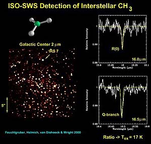 More than expected "The unexpected amount of CH3 is a very important aspect. None of the models predict so much CH3. This comes indeed as a surprise, since these models reproduce very well the abundance of many other molecules. So, what is wrong? Are we missing some important aspect of the chemistry?", says Helmut Feuchtgruber, from the Max-Planck Institut f=FCr Extraterrestrische Physik and lead author of the discovery. Feuchtgruber underlines also "how thrilled Herzberg would have been with this detection". To experts in space chemistry this discovery confirms the key role ISO is playing in this field. ISO has observed a wealth of molecules in space, both in the gaseous and solid form, e.g. water, ices and crystalline silicates. The methyl radical CH3 itself was detected extraterrestrially for the first time by ISO on Saturn and Neptune in 1998 and 1999 respectively. To Feuchtgruber, "ISO's role in unveiling the chemical processes in space is unique. ISO spectrometers cover the important spectral range where the most abundant molecules have their infrared transitions. The fact that many molecules can be observed simultaneously with the same observatory, or even the same instrument, results in unprecedented accuracy of abundances for these molecules, and as a consequence the chemistry in space can be better understood. The unique sensitivity of the instruments allows also to detect minor species and species which cannot be detected because of the Earth's atmosphere, extending our knowledge about the processes and raising new puzzling questions". The first detection of the free radical CH3 in the interstellar space is reported in the paper by H. Feuchtgruber, F.P. Helmich, E.F. van Dishoeck and C.M. Wright, which appeared in 'The Astrophysical Journal, 535: L111-L114, 2000 June 1'. The paper is based on data from both spectrometers on board ISO, the Short Wavelength Spectrometer, SWS, and the Long Wavelength Spectrometer, LWS.